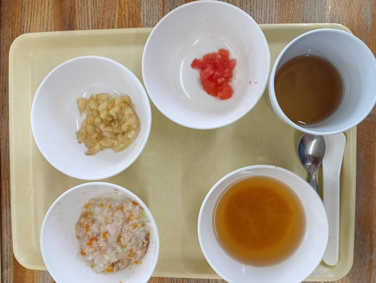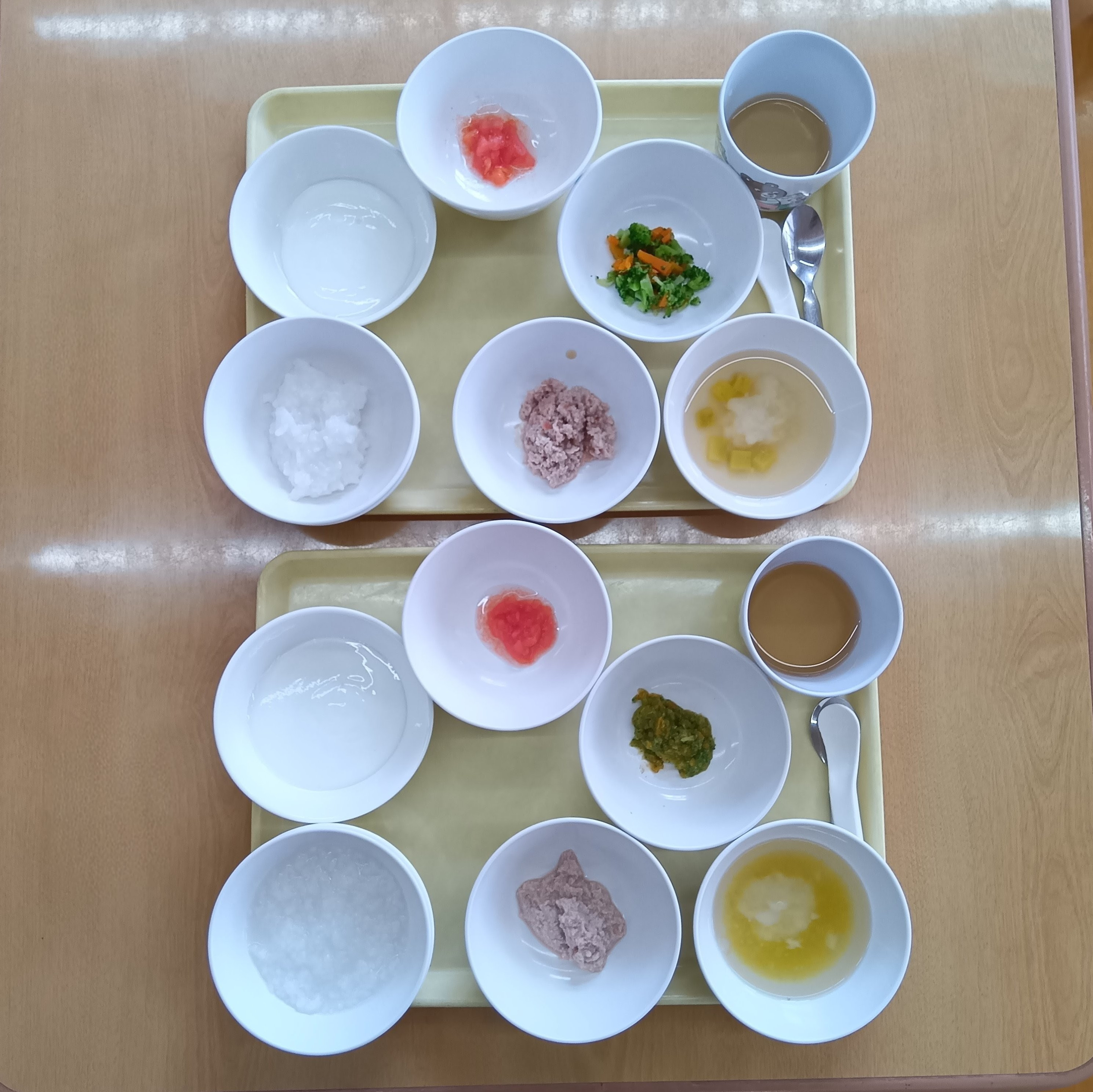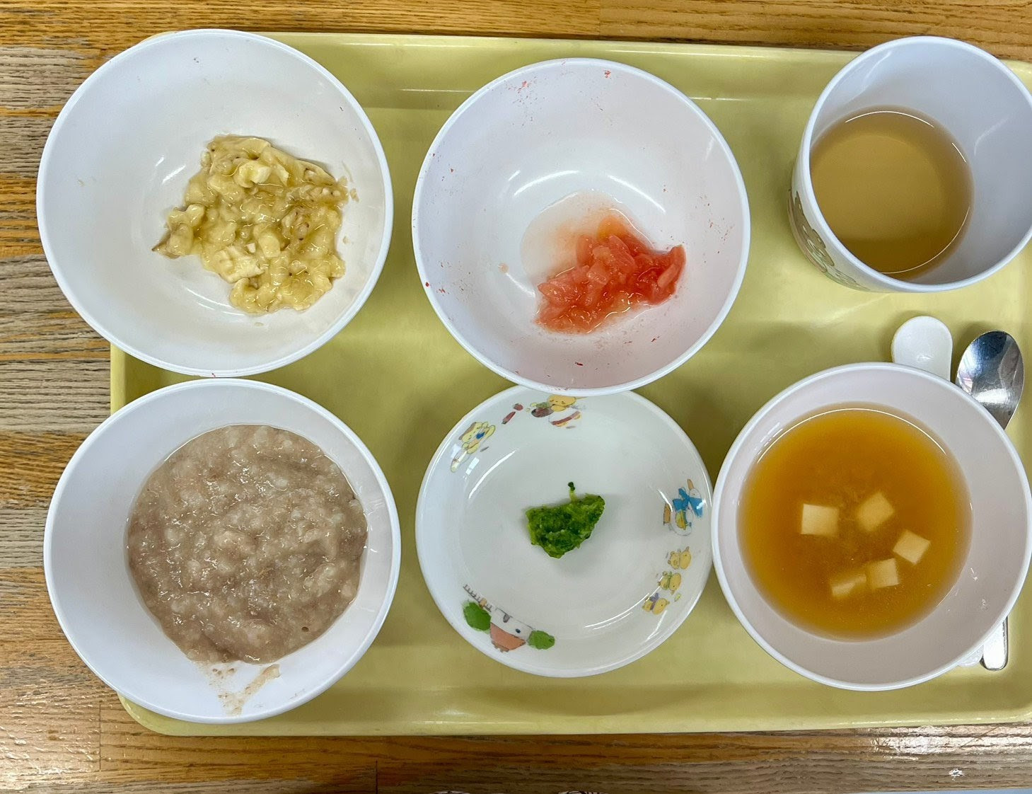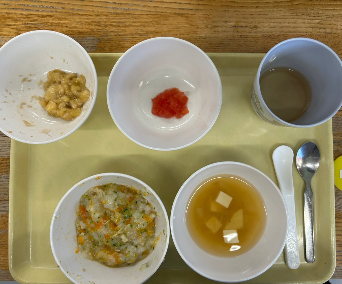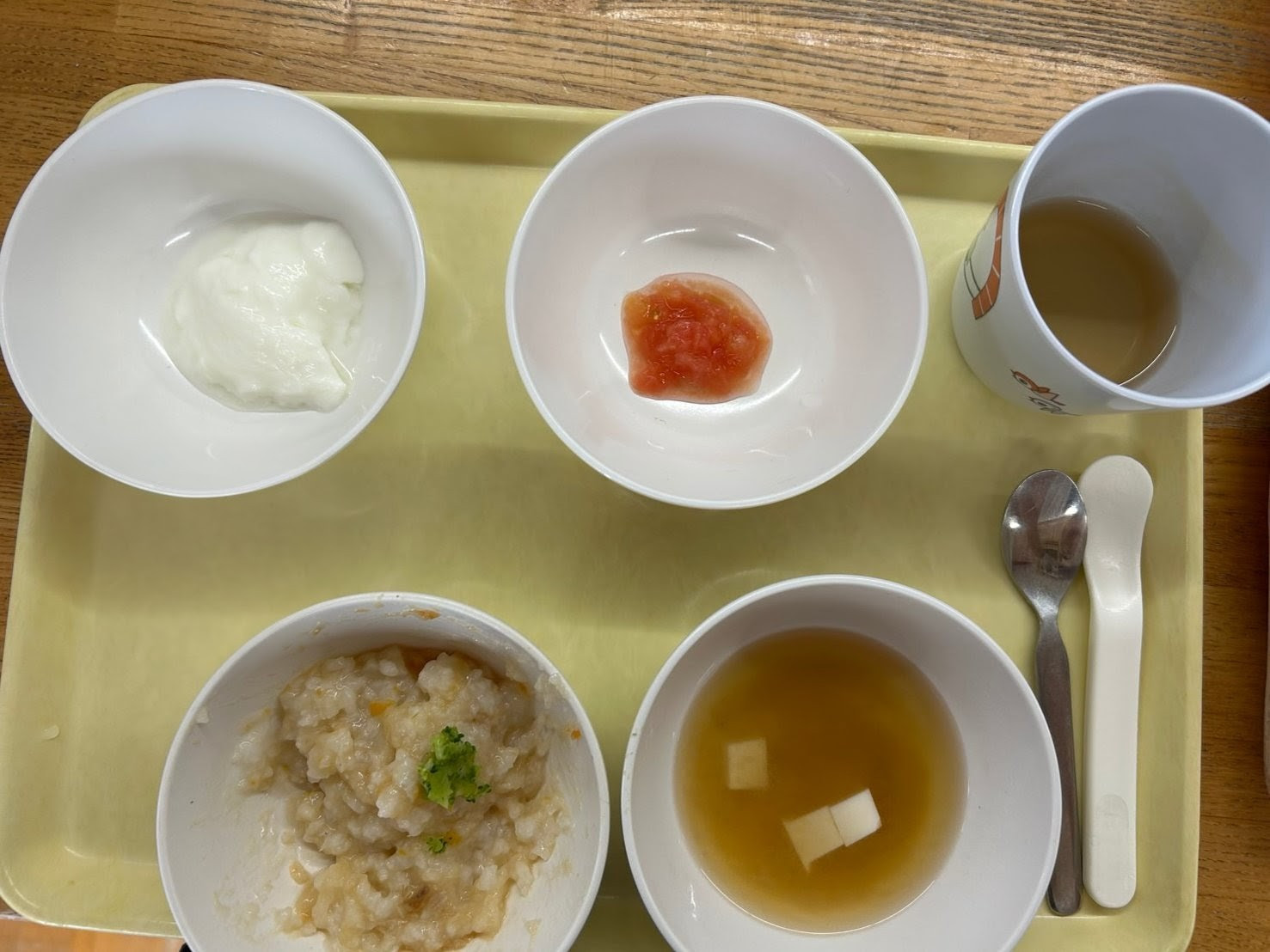今日はモモでの初めての離乳食、お母さんと一緒に食べてもらいます。ご飯の硬さなども試してもらって、今の咀嚼に合わせます。