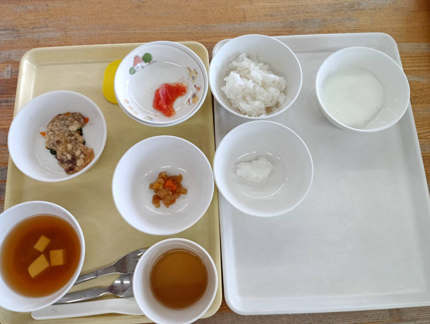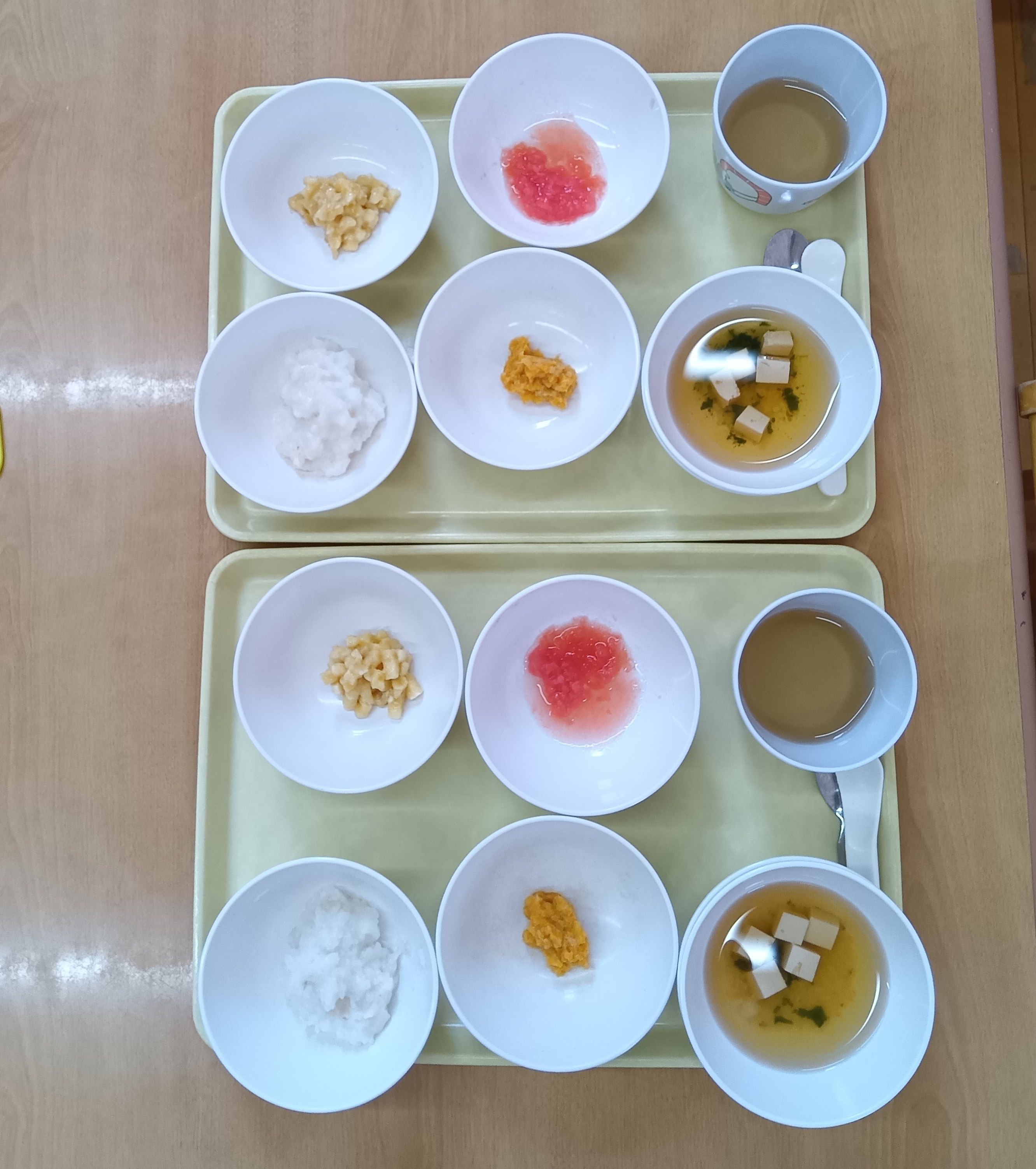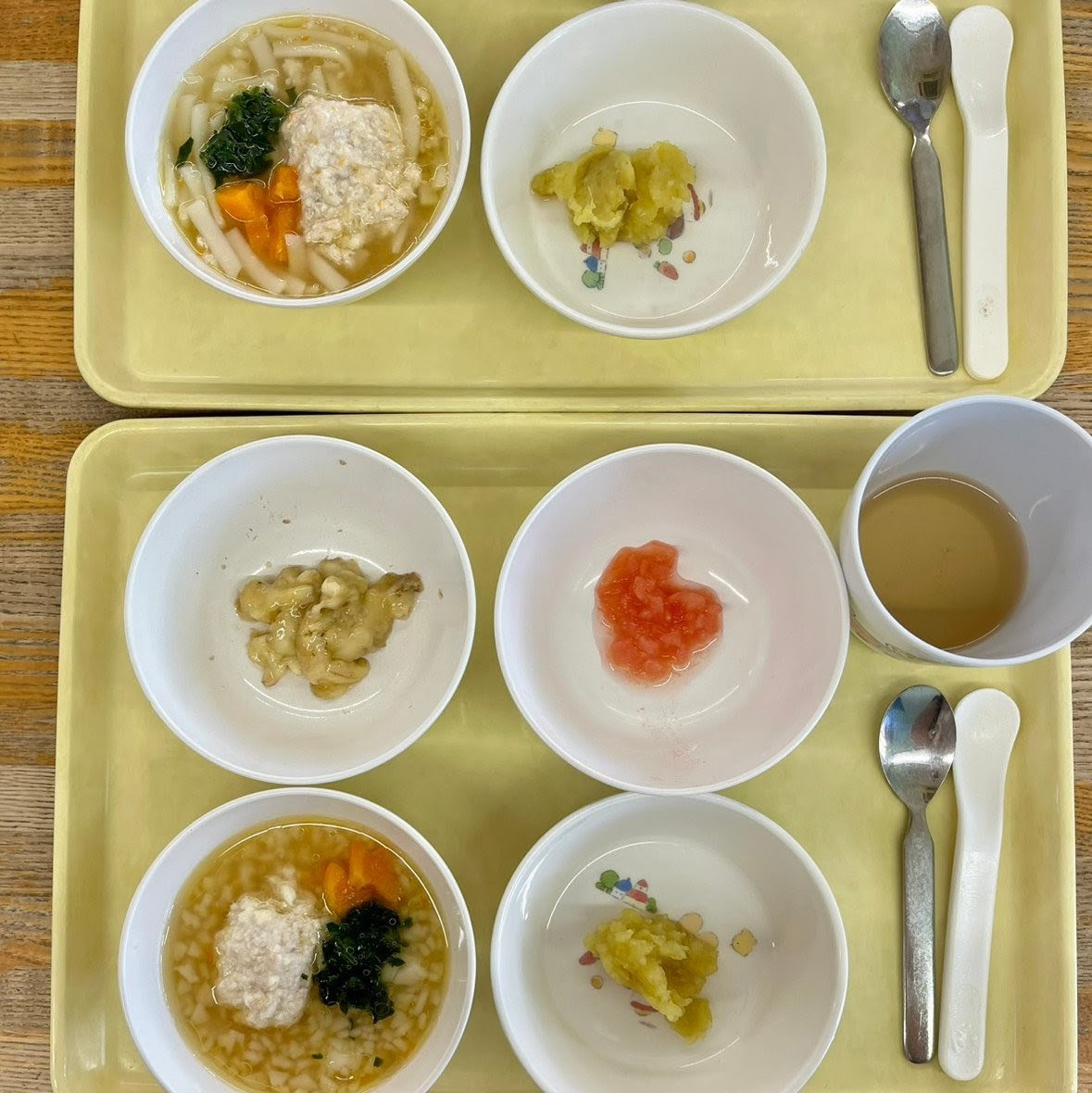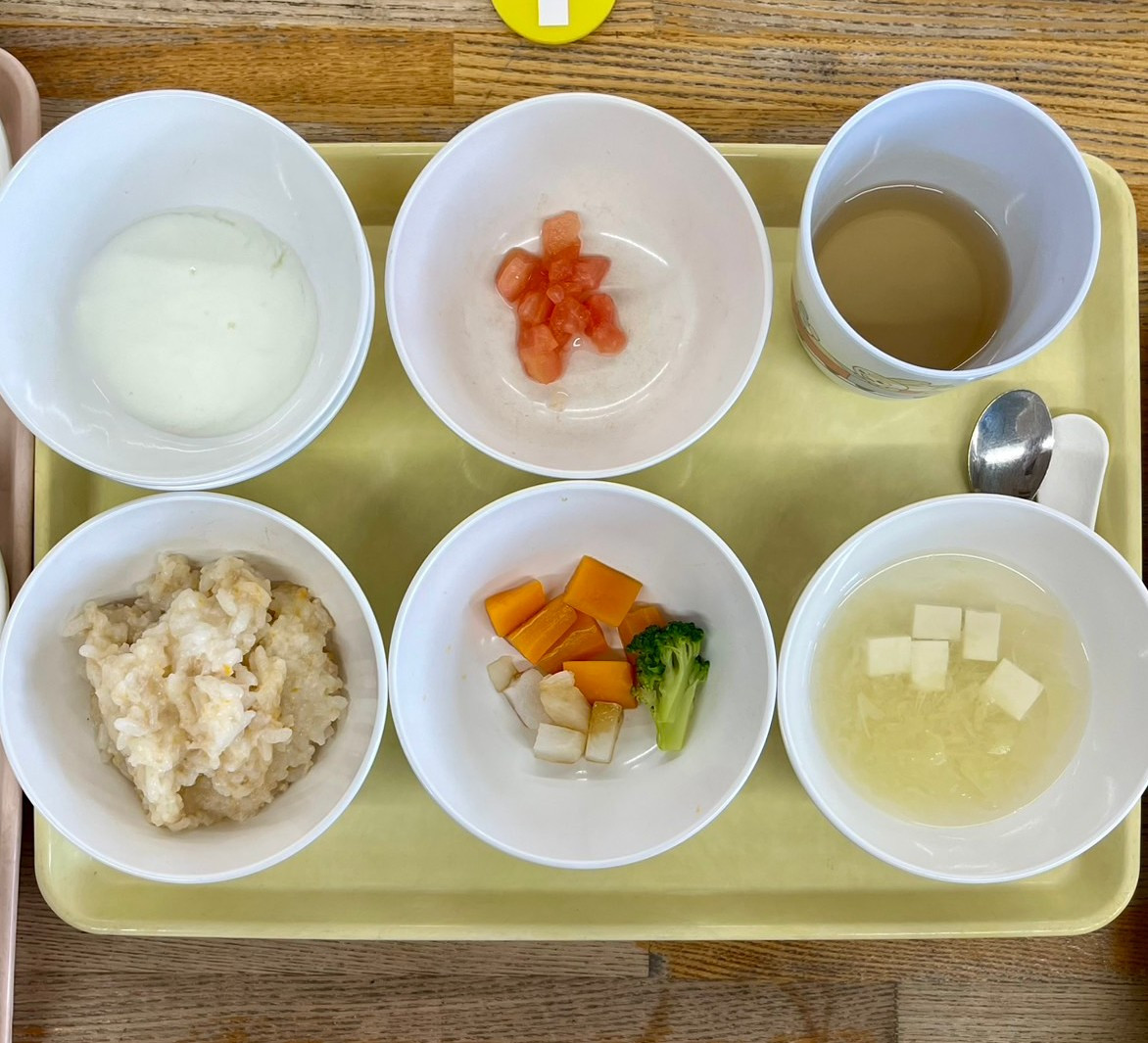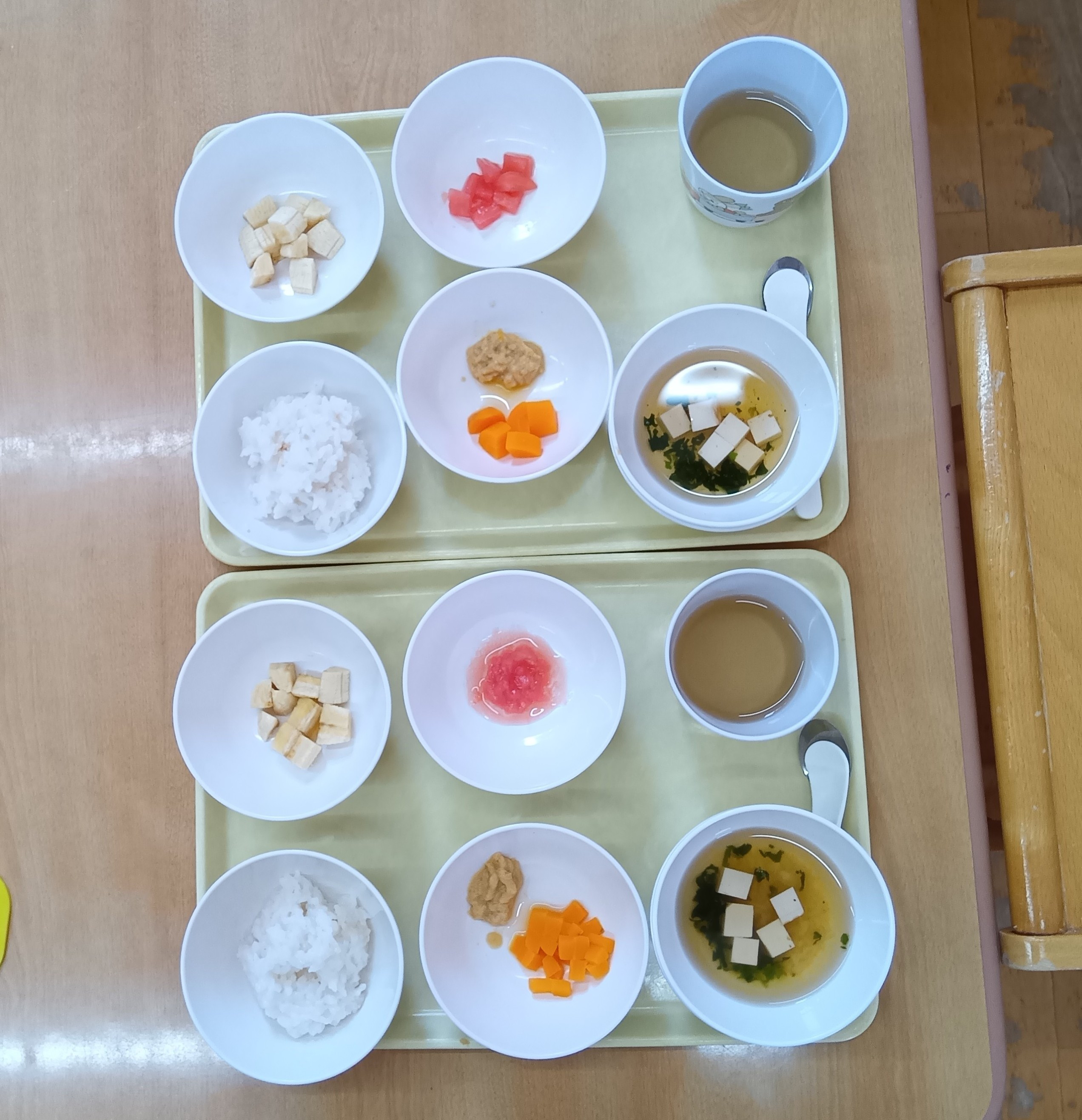 今日はモモでの初めての離乳食、お母さんと一緒に食べてもらいます。ご飯の硬さなども試してもらって、今の咀嚼に合わせます。