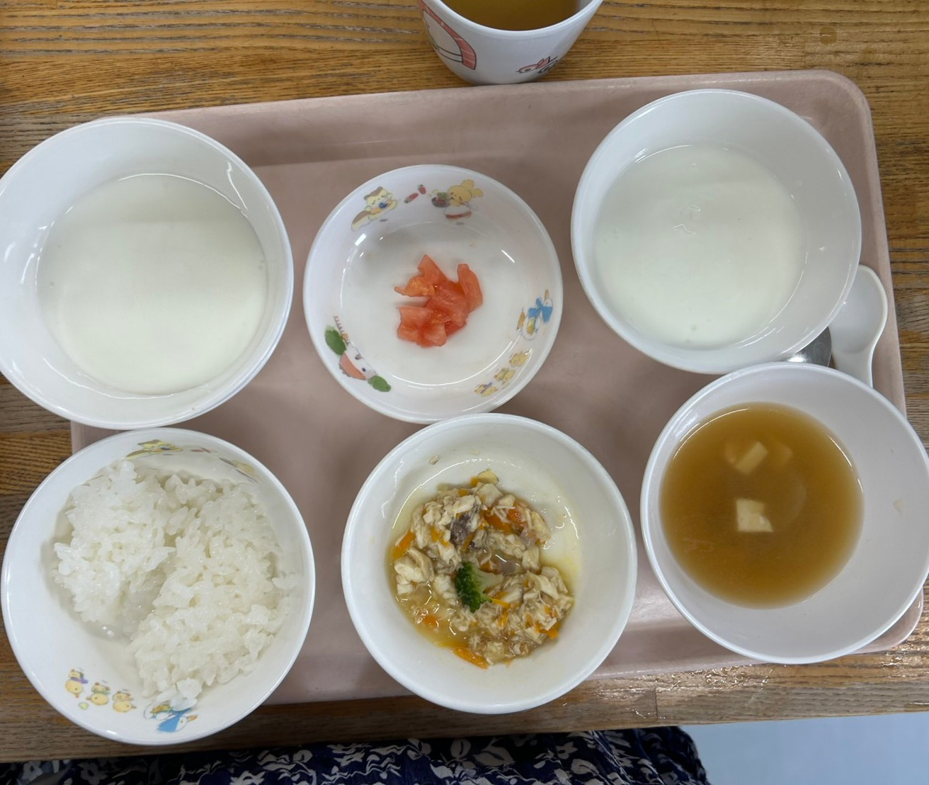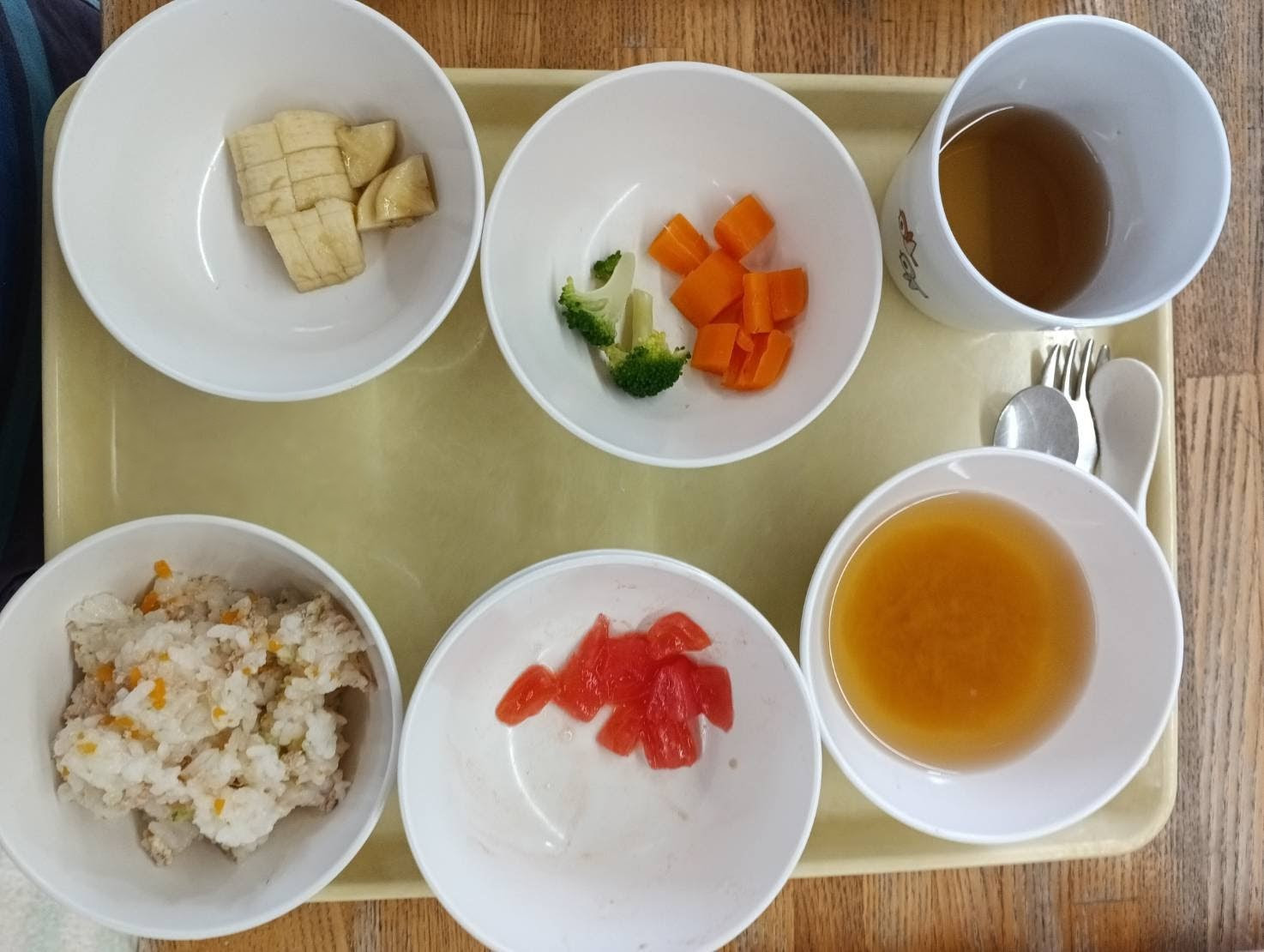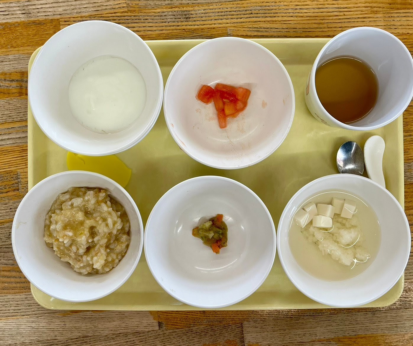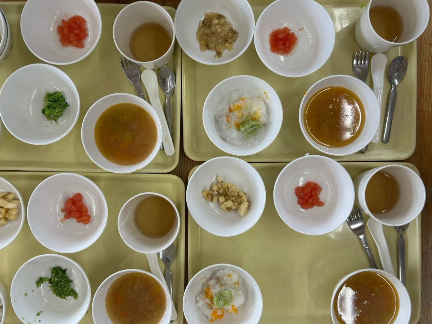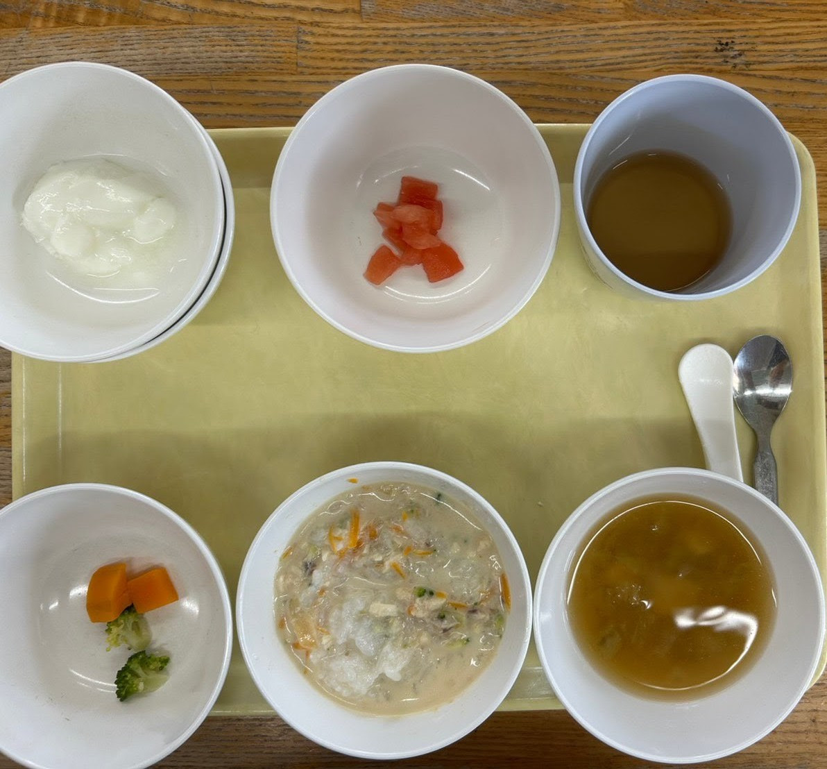 今日はモモでの初めての離乳食、お母さんと一緒に食べてもらいます。ご飯の硬さなども試してもらって、今の咀嚼に合わせます。