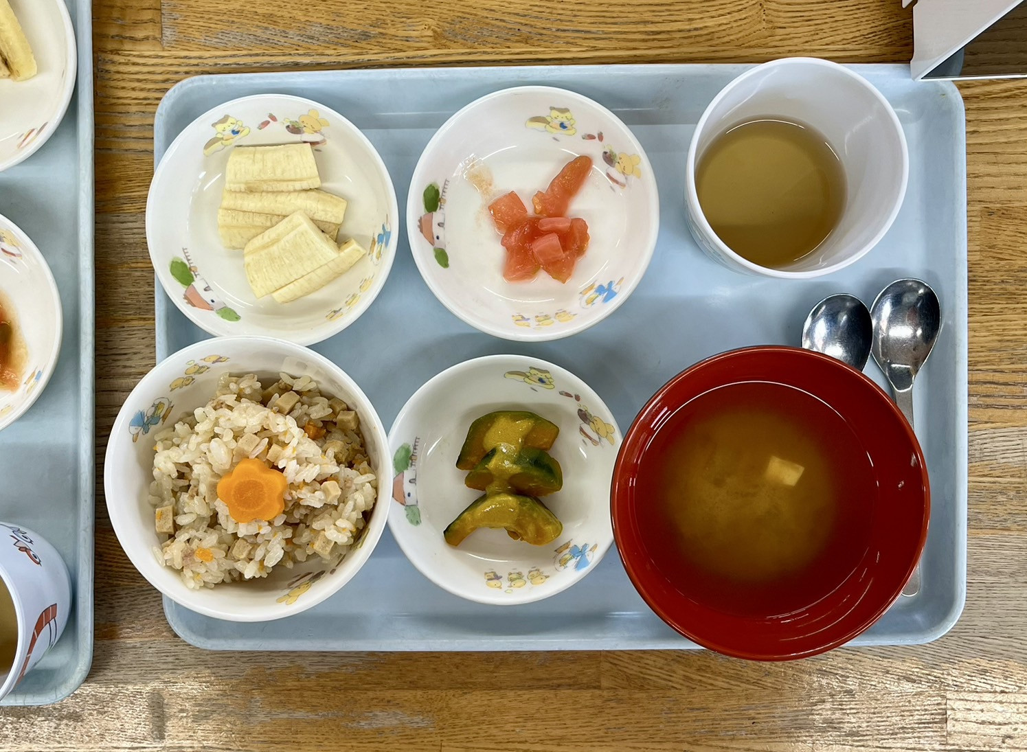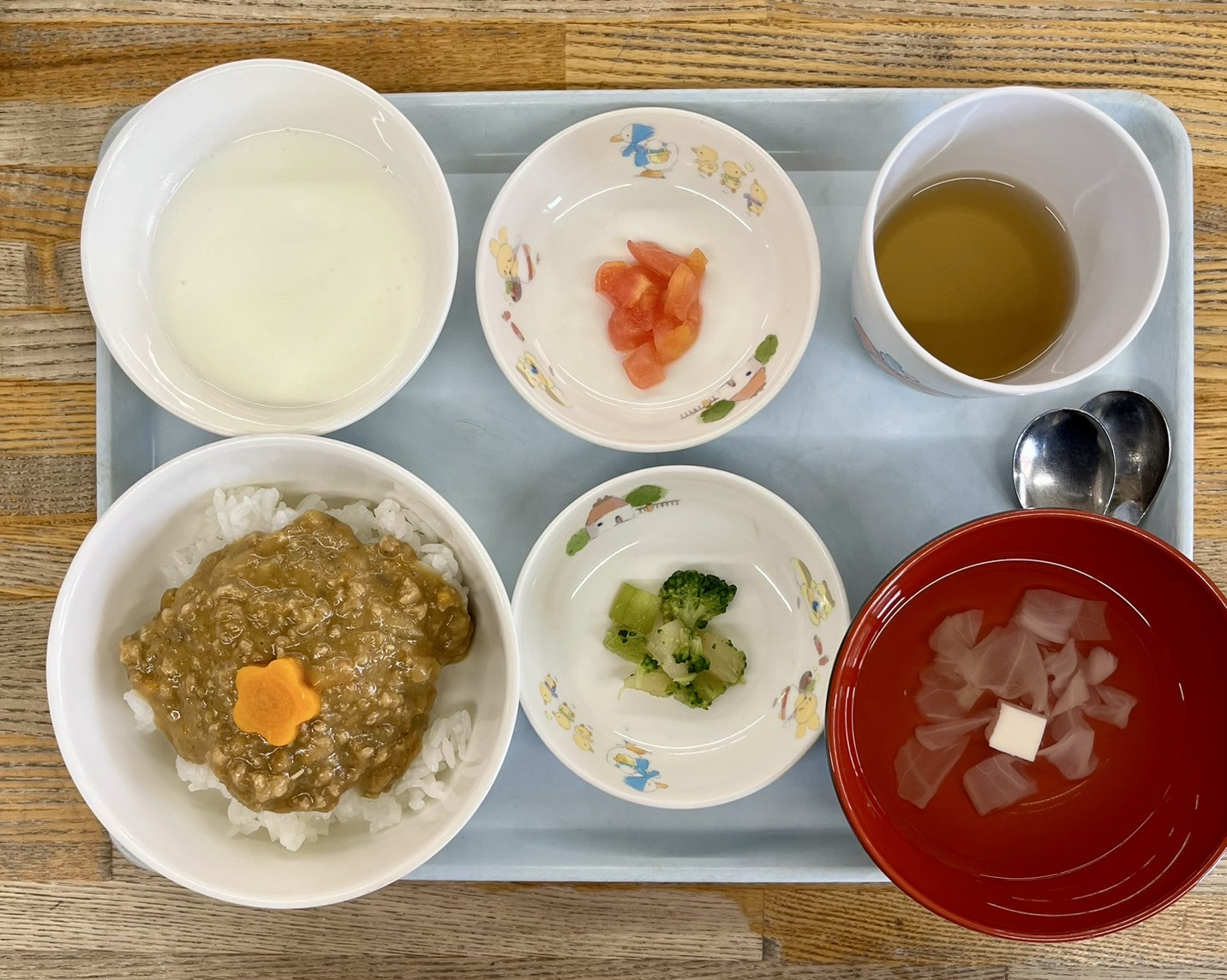 高野豆腐のそぼろご飯 みそ汁 かぼちゃのミルク煮 トマト バナナ