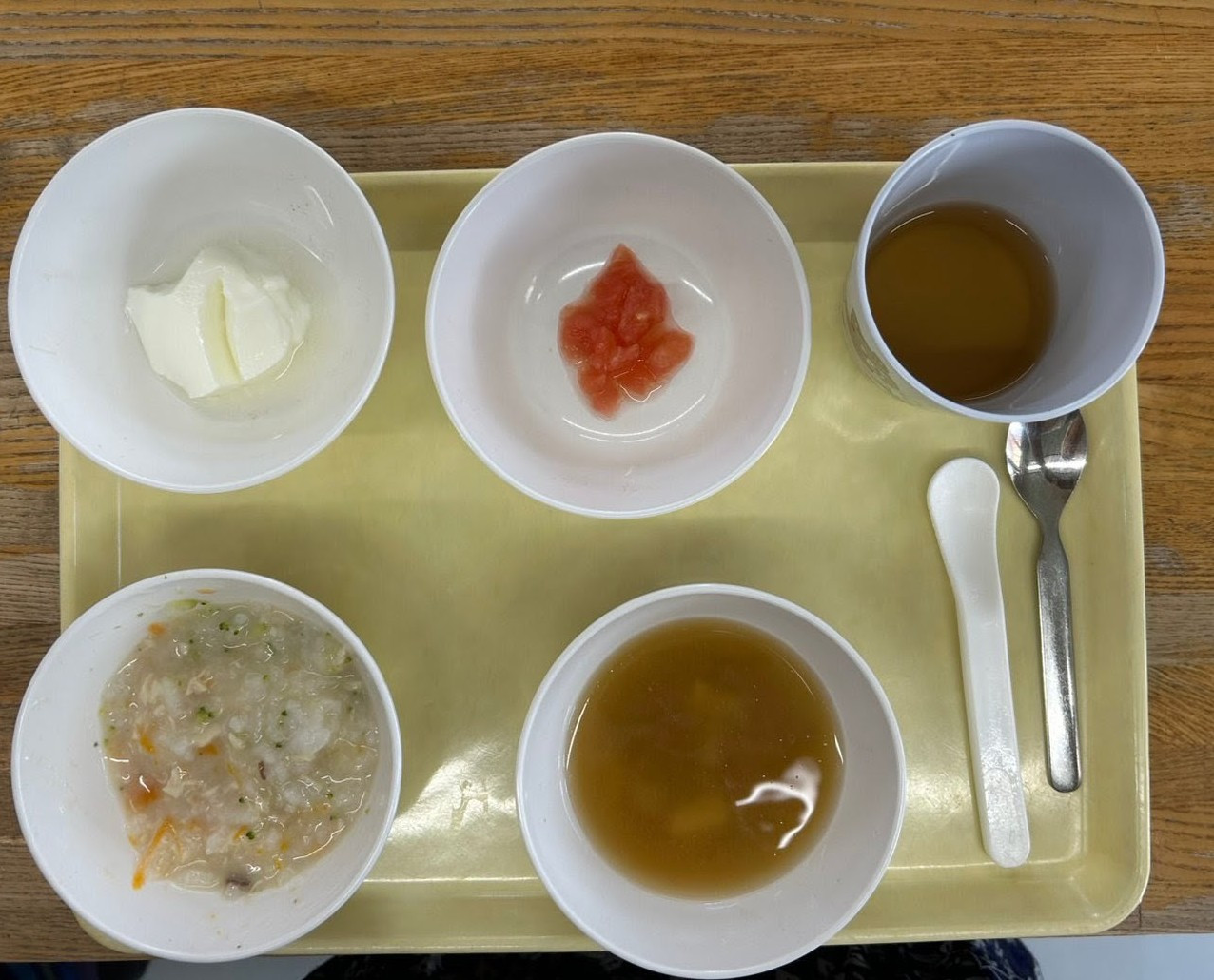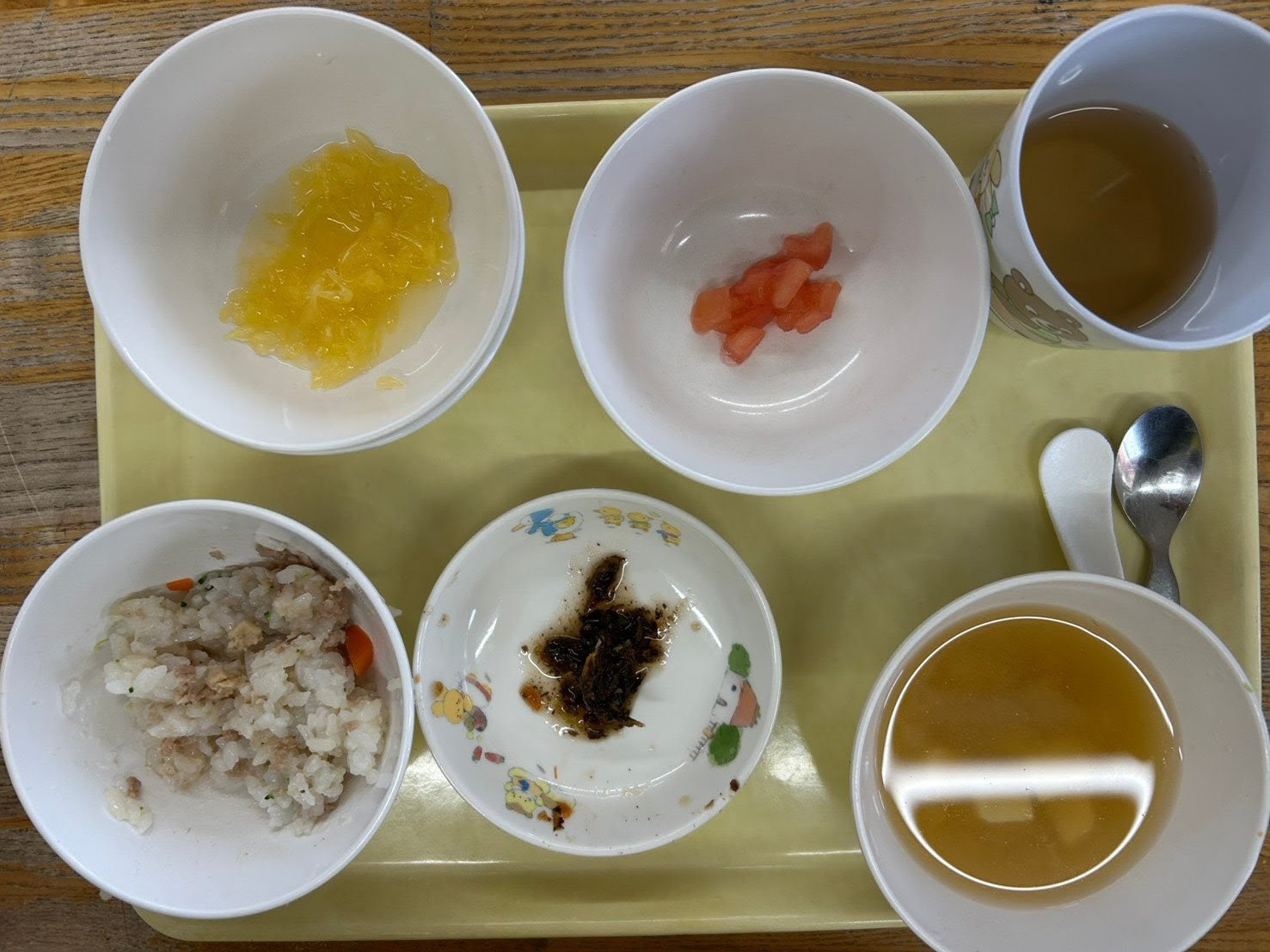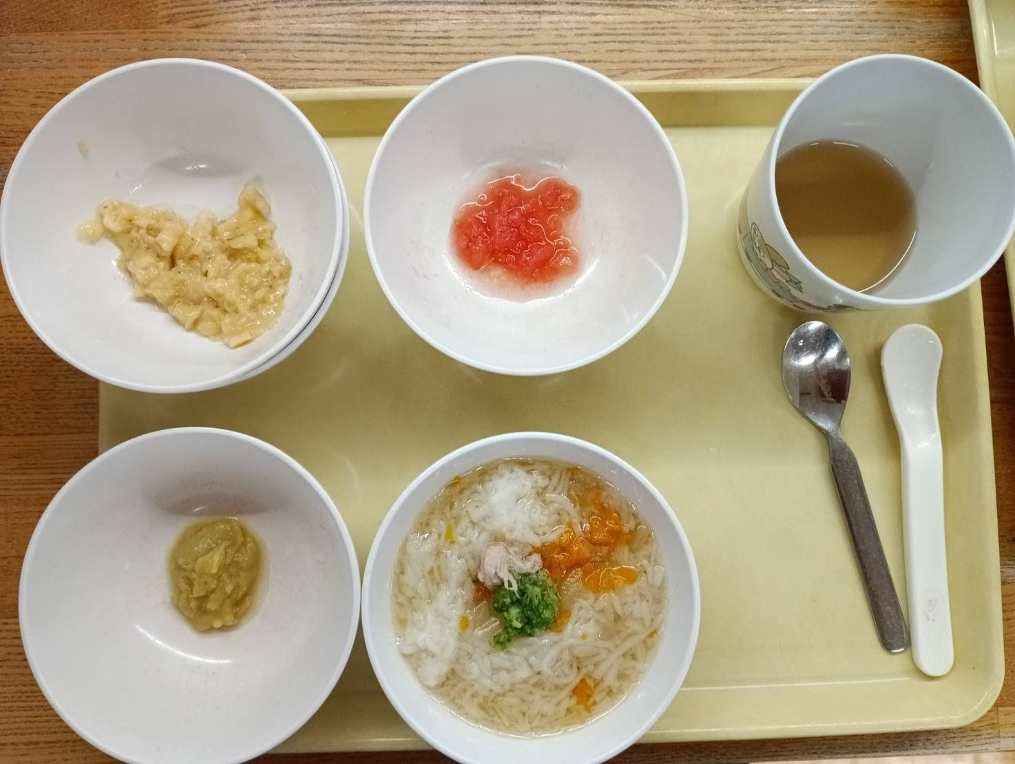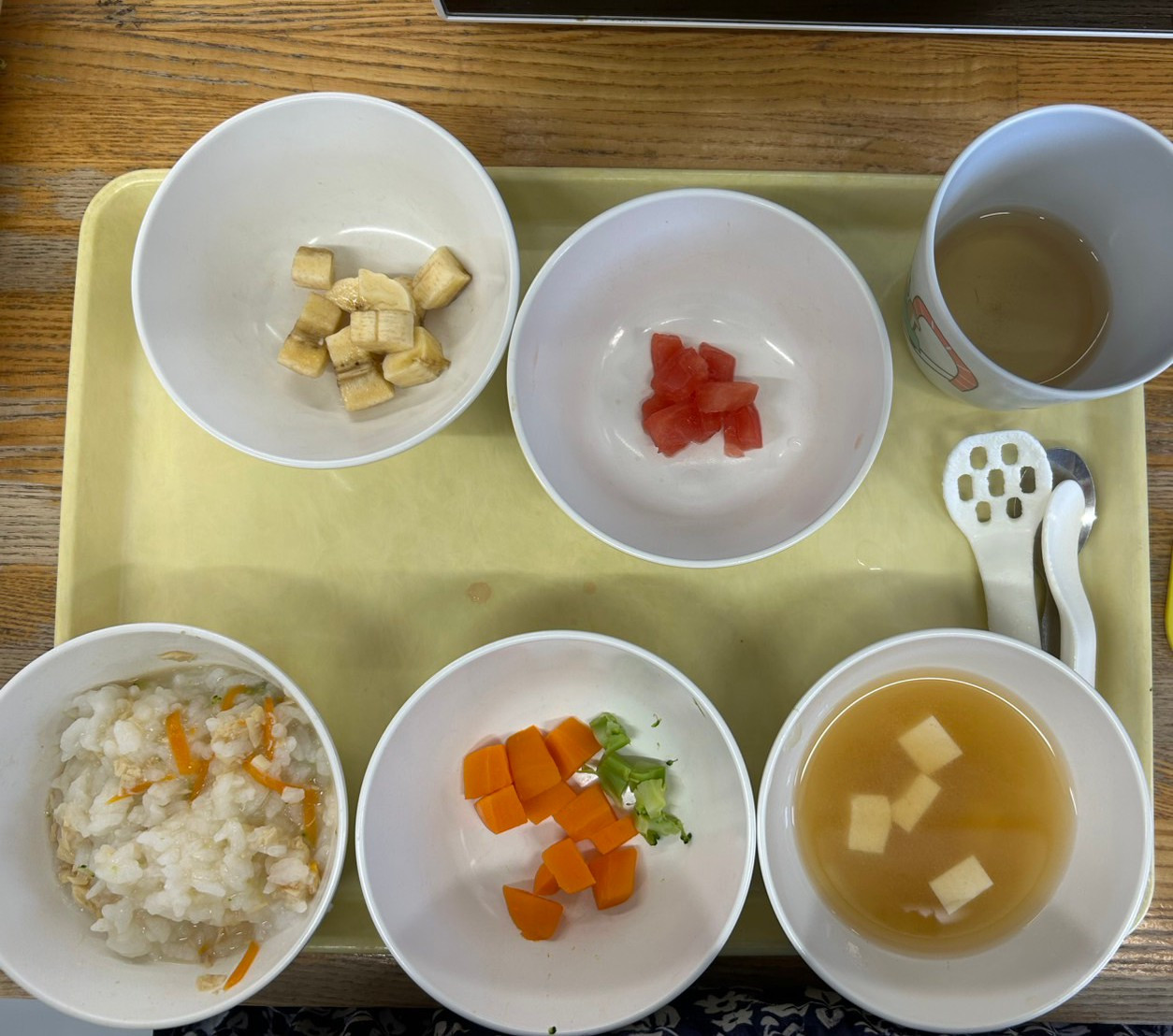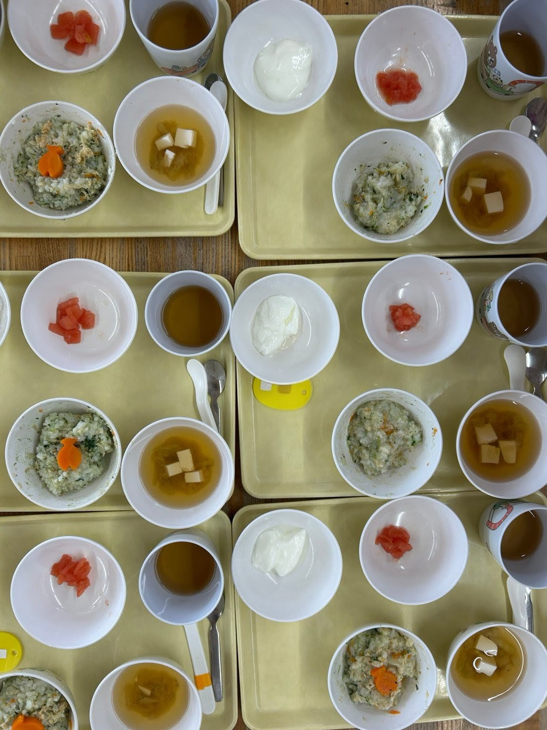 ずいぶん慣れてくれた離乳食。今日はおじやを主に盛り付けましたが、小さく切っためん類(素麺)にも挑戦です。