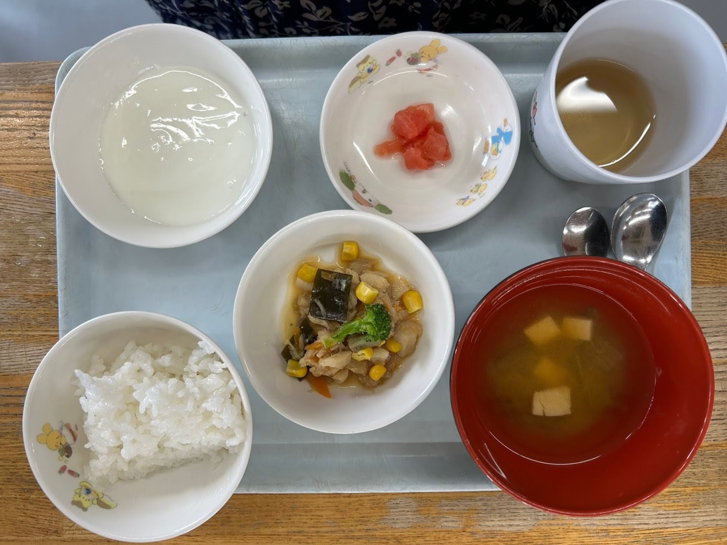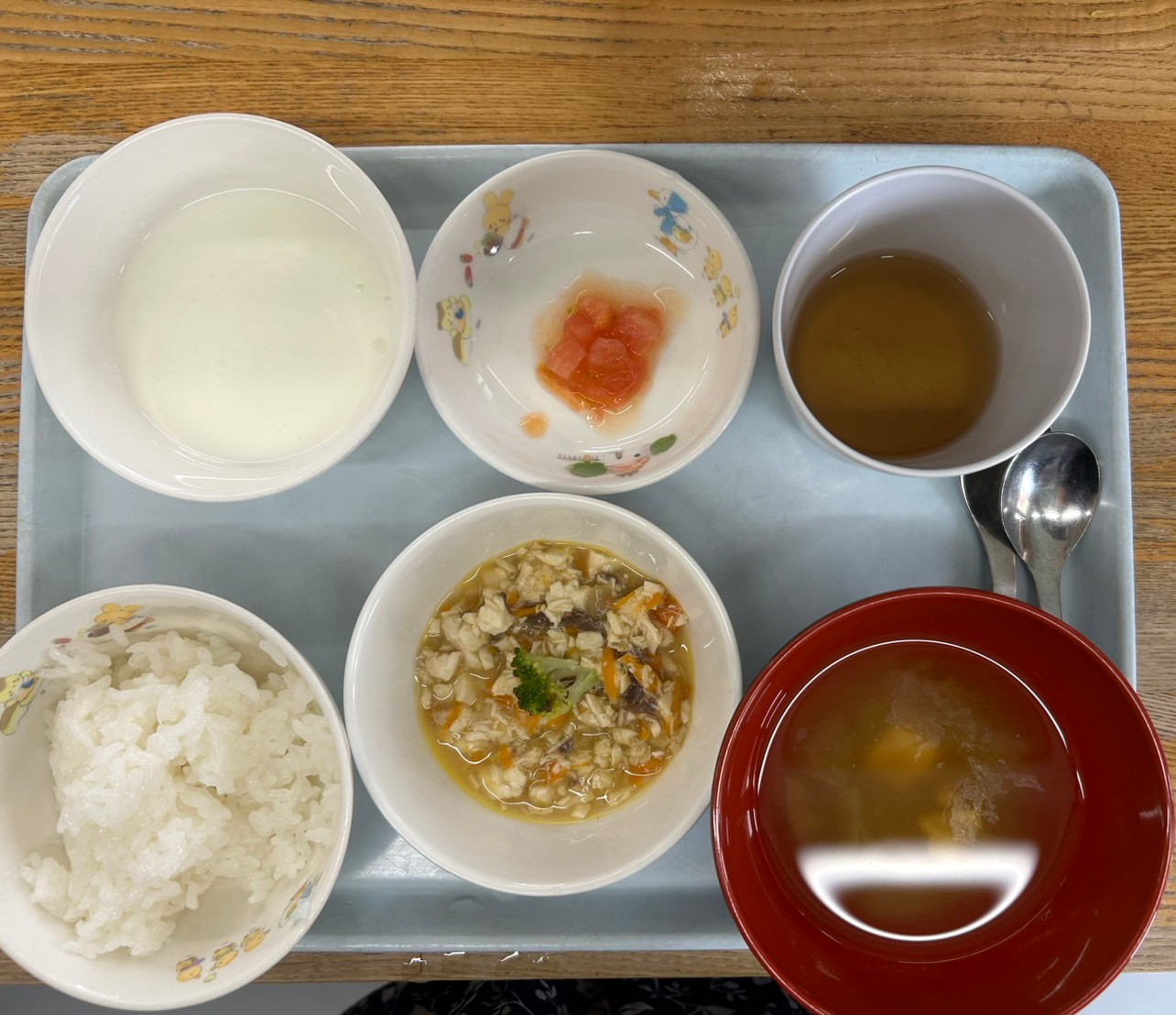 ご飯 みそ汁 魚の野菜入り味噌煮 トマト ヨーグルト
