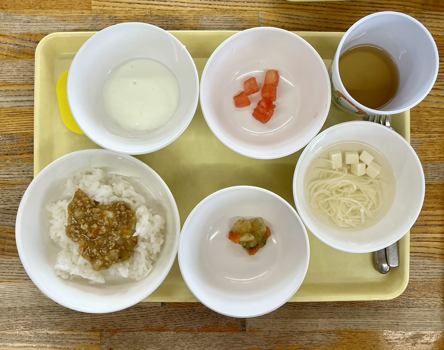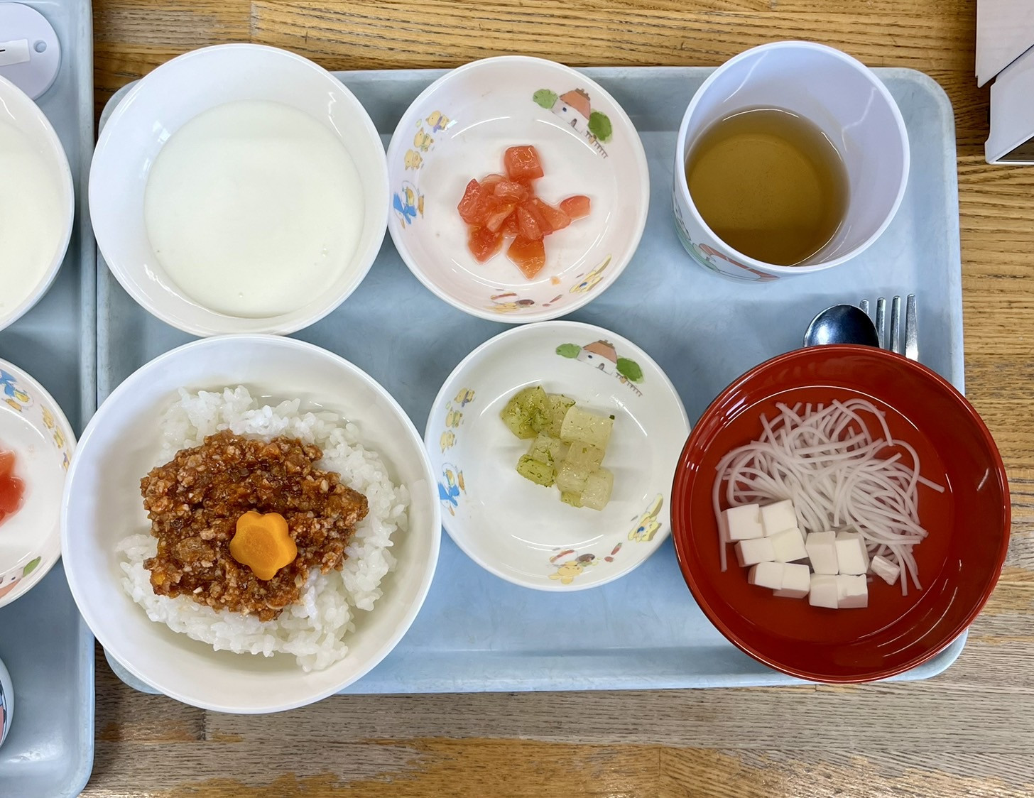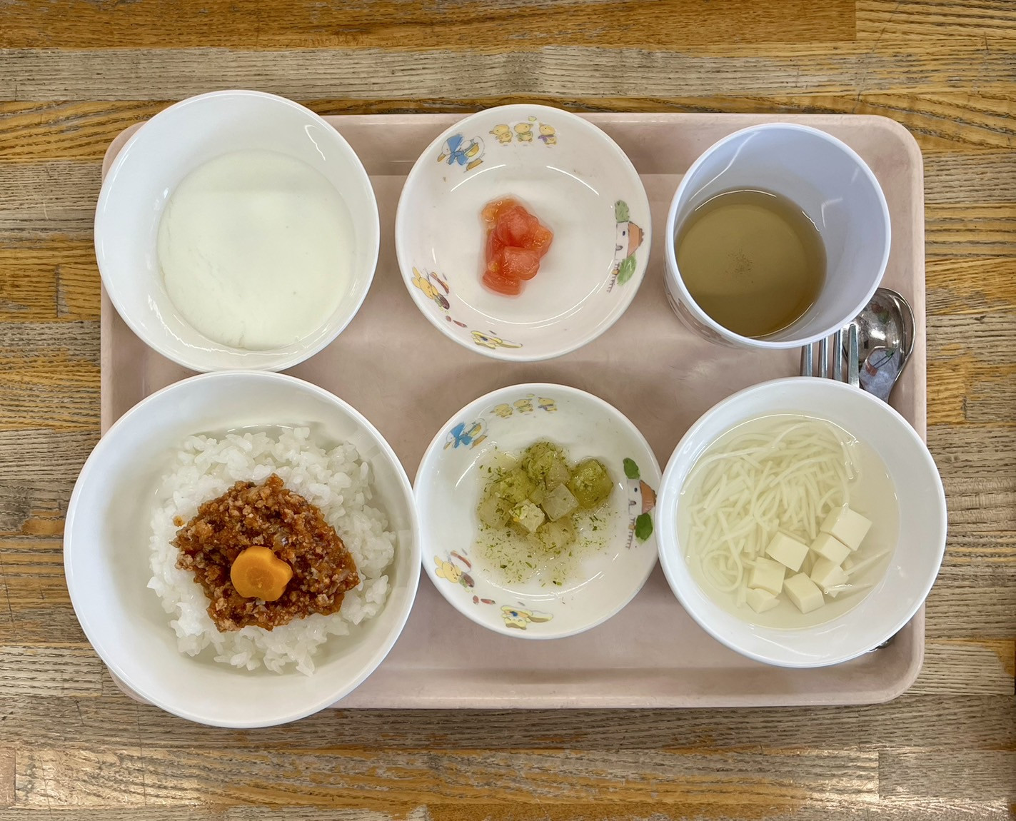 カジキのそぼろご飯 素麺入りすまし汁 人参シリシリ トマト バナナ
