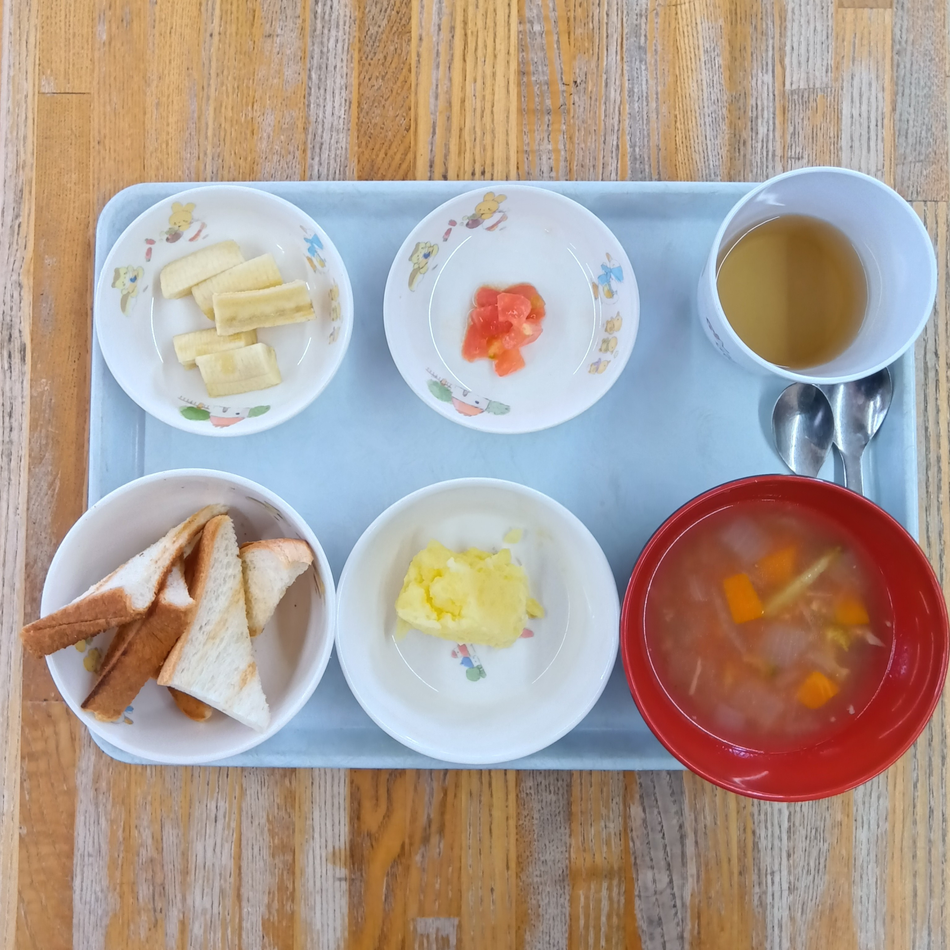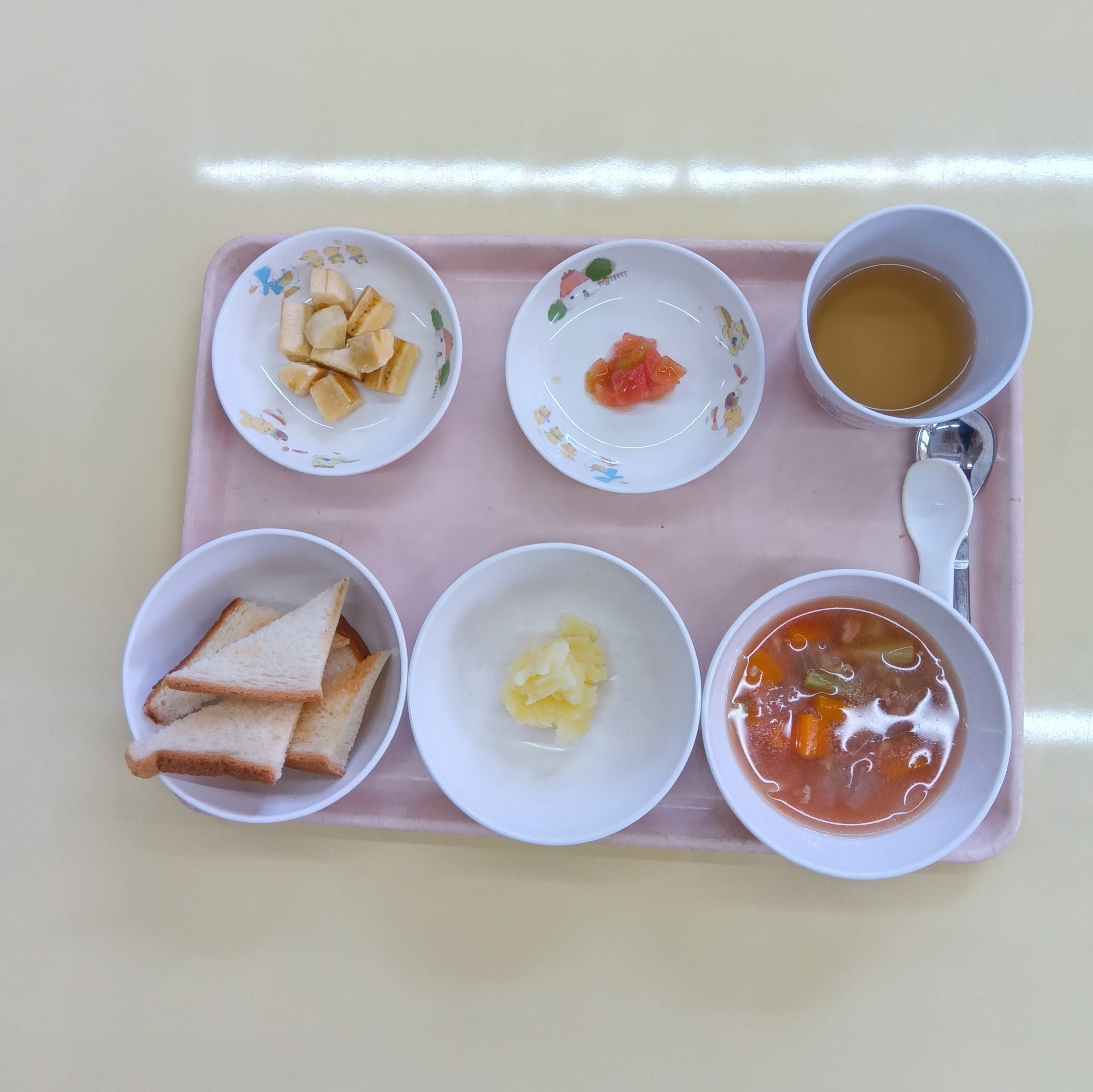 食パン ミネストローネスープ マッシュポテト トマト バナナ