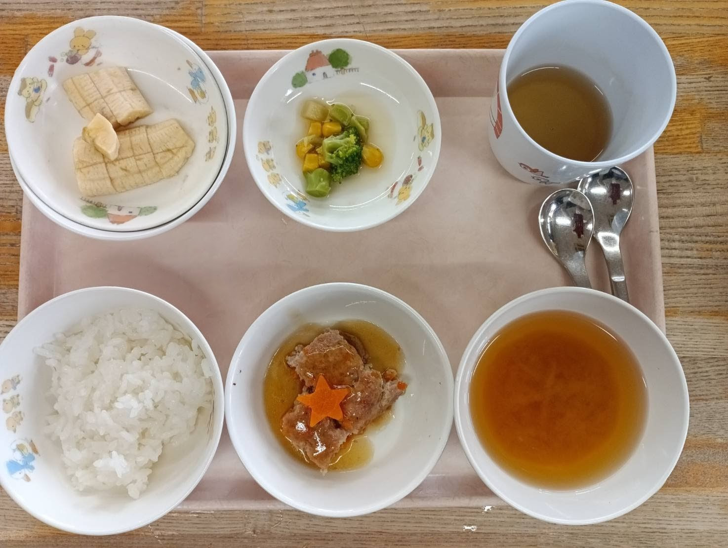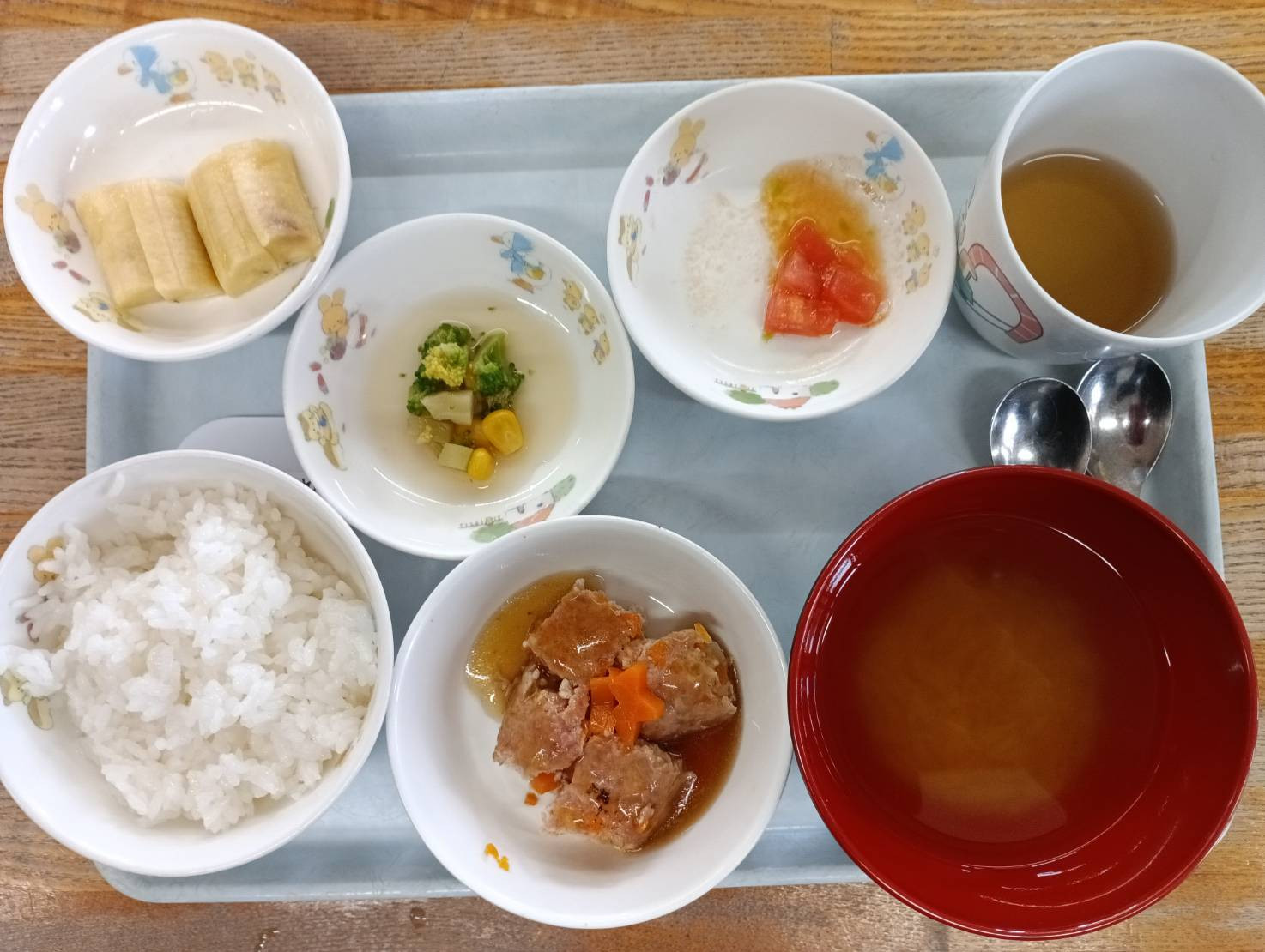 ご飯 みそ汁 魚の味噌煮 青菜のコーン炒め トマト バナナ
