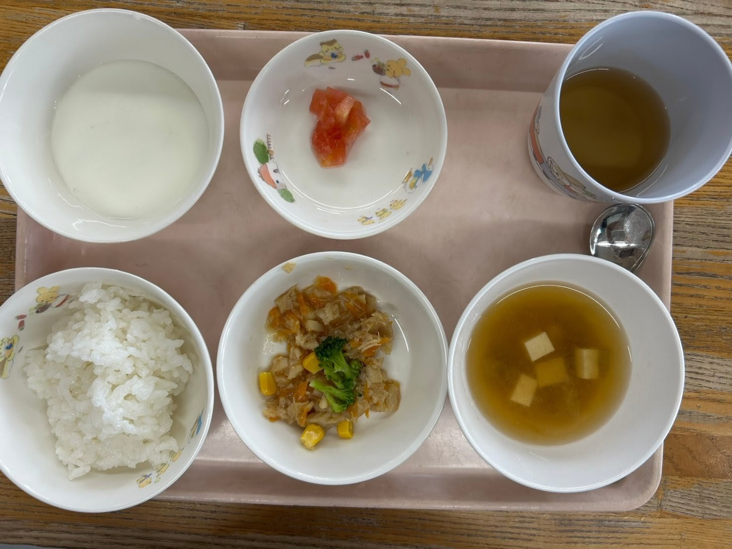 ご飯 みそ汁 揚げレバーの野菜煮 トマト ヨーグルト