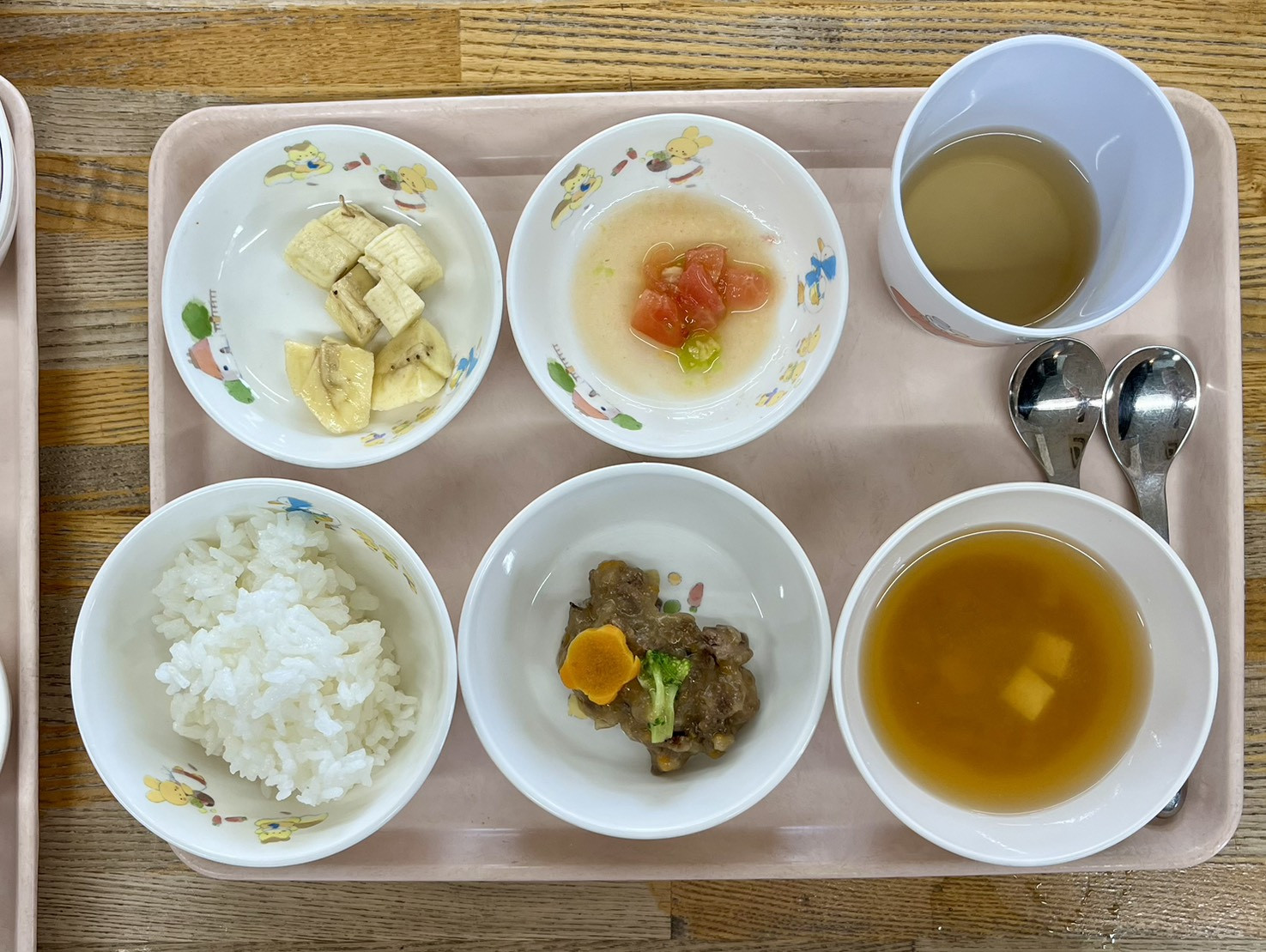 ご飯 みそ汁 野菜入りレバーの甘辛煮 トマト バナナ