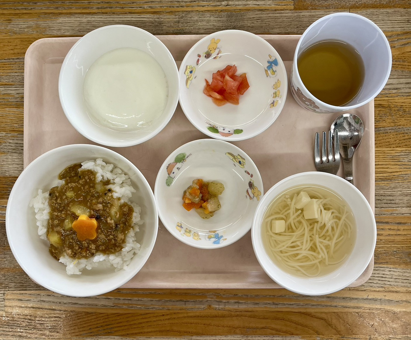 カレーライス スープ 和風サラダ トマト ヨーグルト