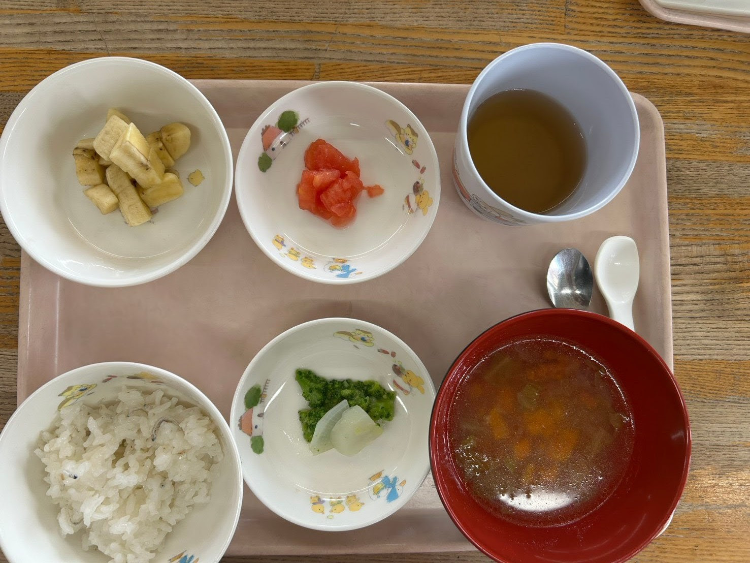 鮭ご飯 冬瓜入りすまし汁 人参シリシリ 青菜和え トマト バナナ(ヨーグルト)