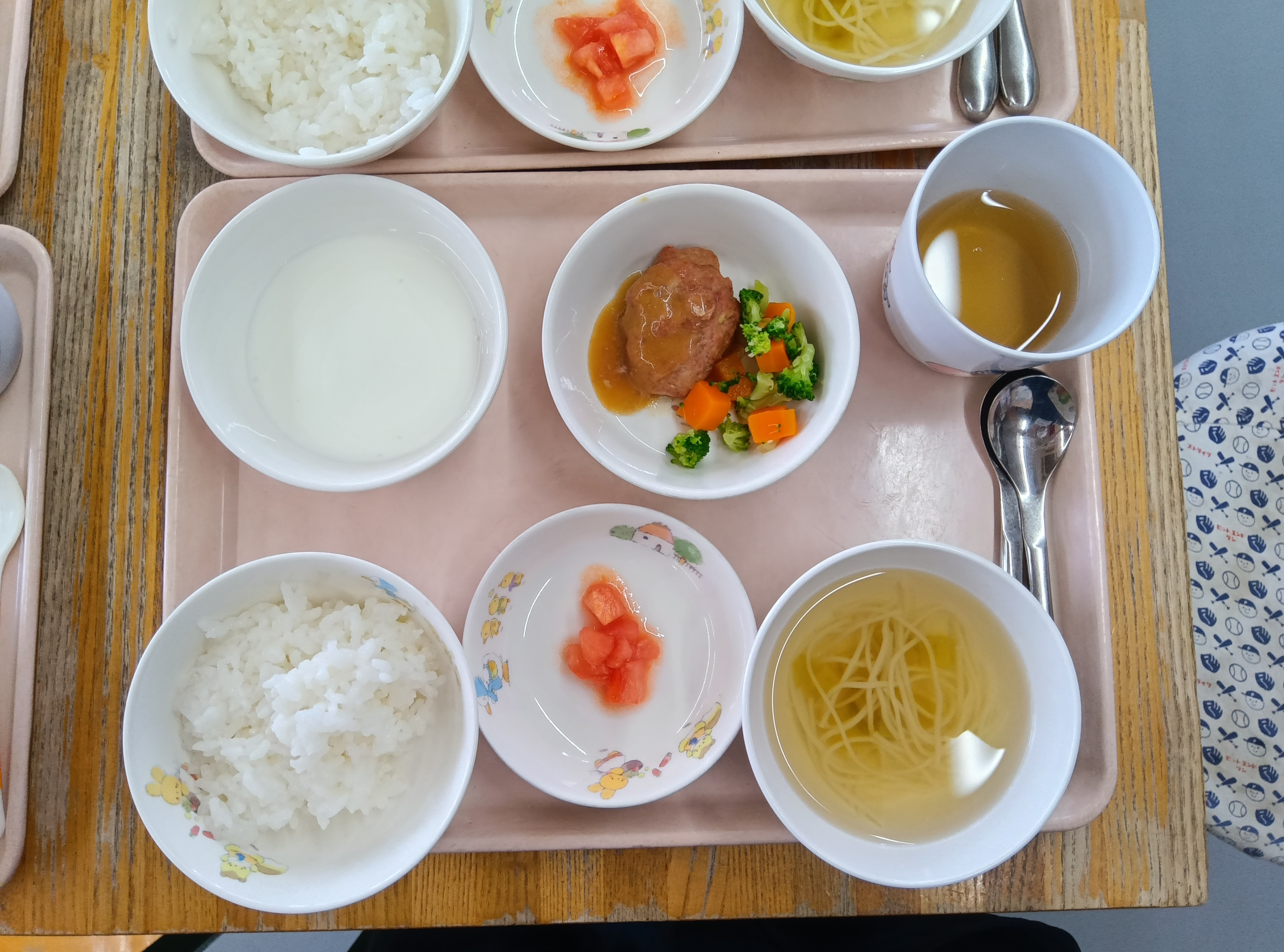 ご飯 すまし汁 味噌味ハンバーグ サラダ トマト バナナ