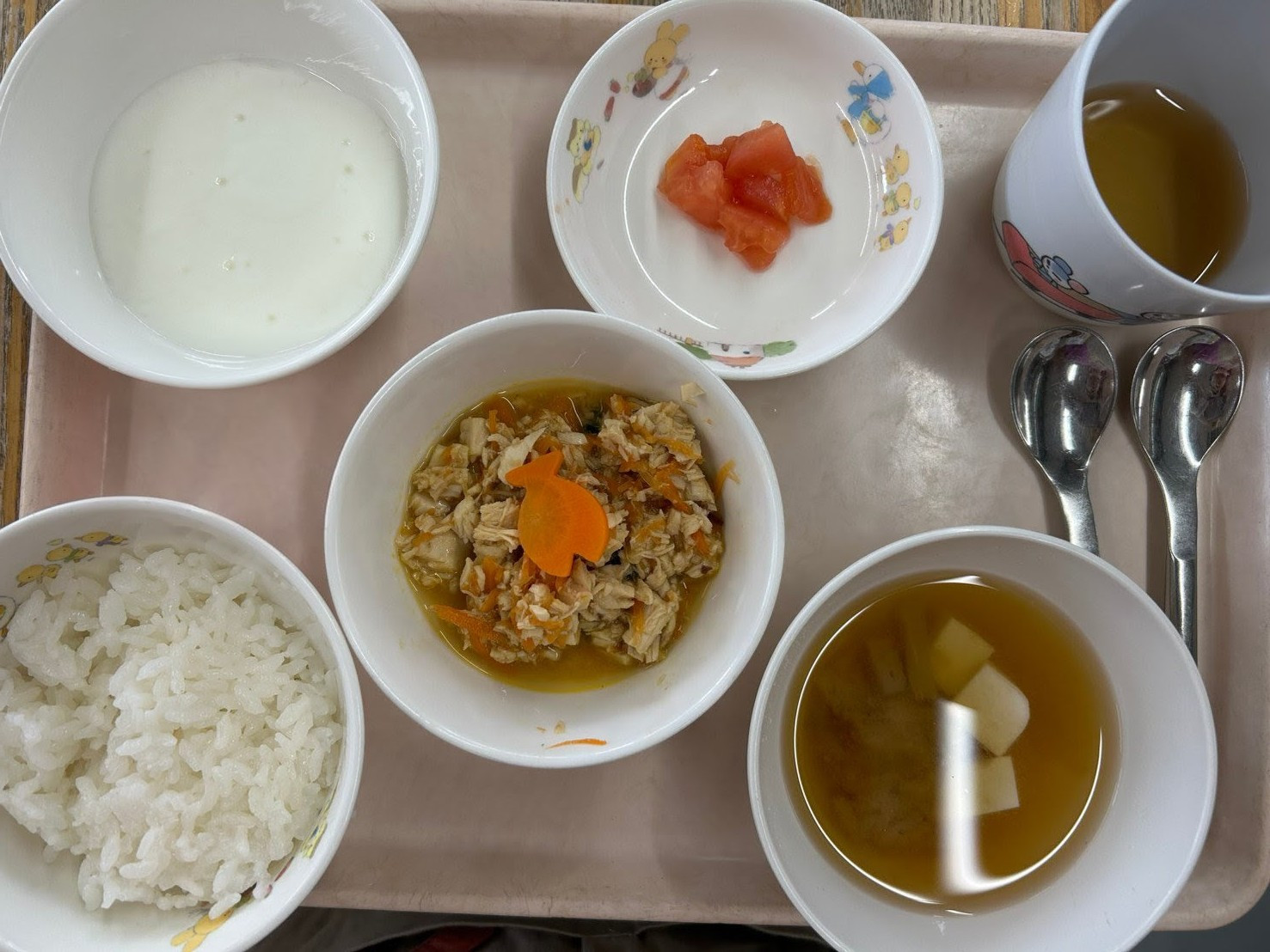 ご飯 みそ汁 魚のカレー風味クリーム煮 トマト ヨーグルト