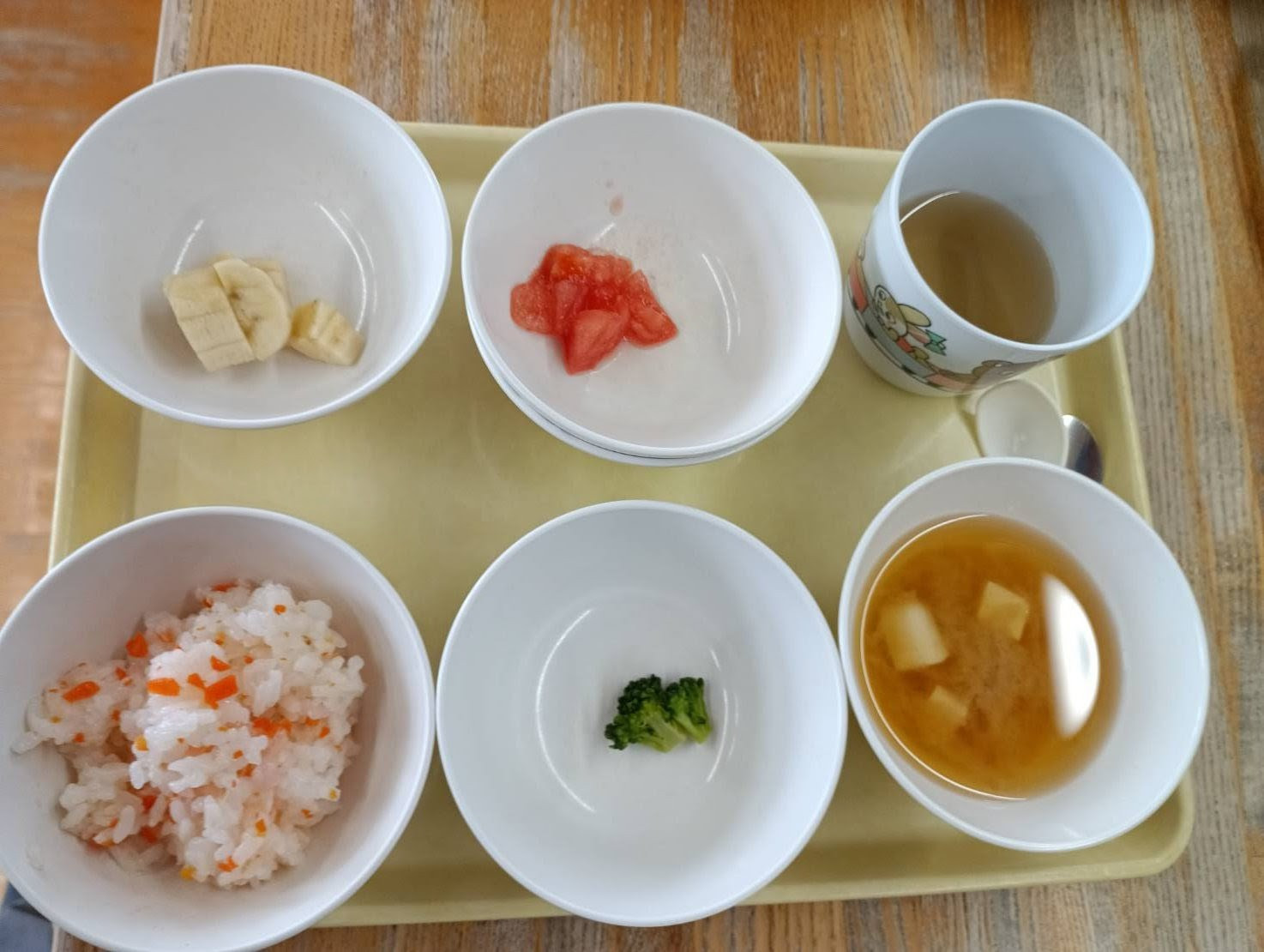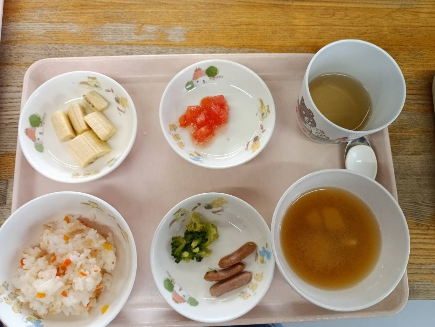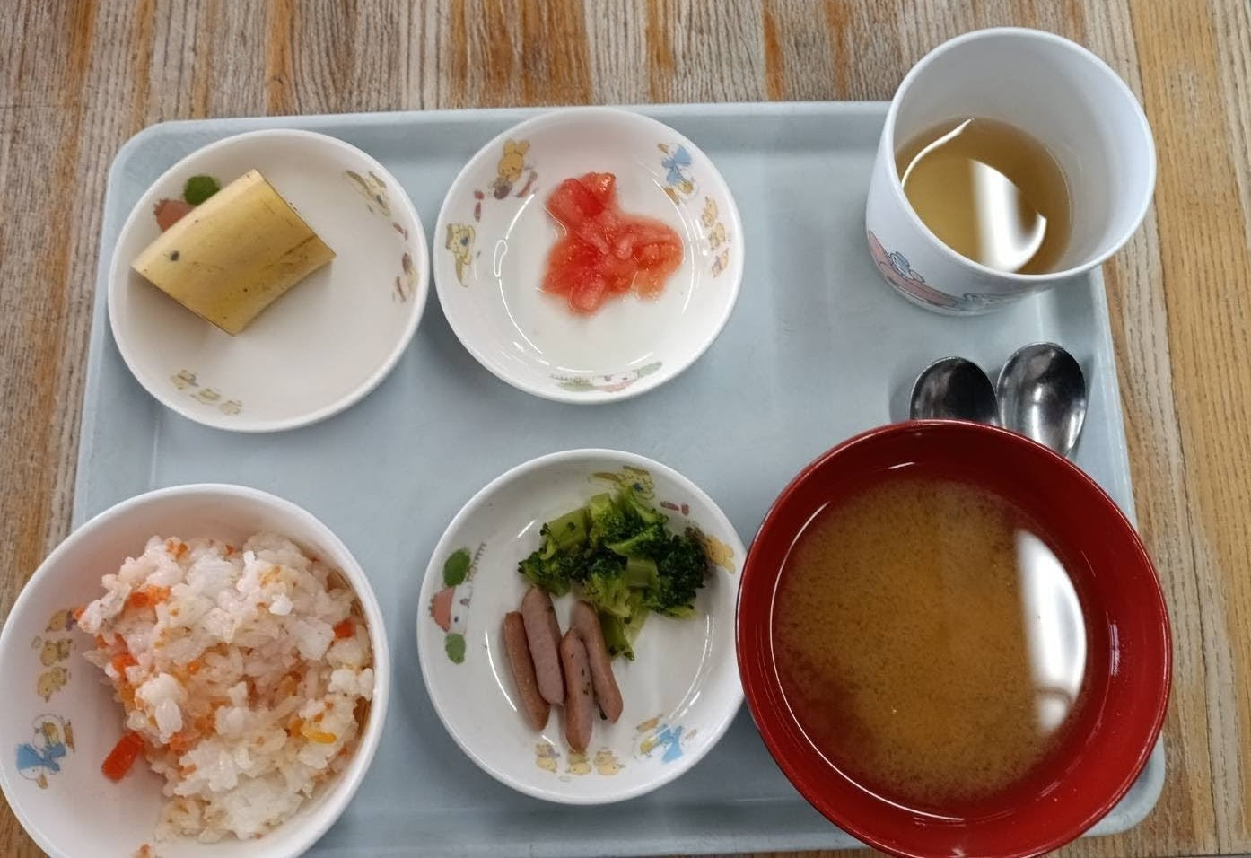 キャロットライス みそ汁 ブロッコリーとウインナーの炒め物 トマト バナナ