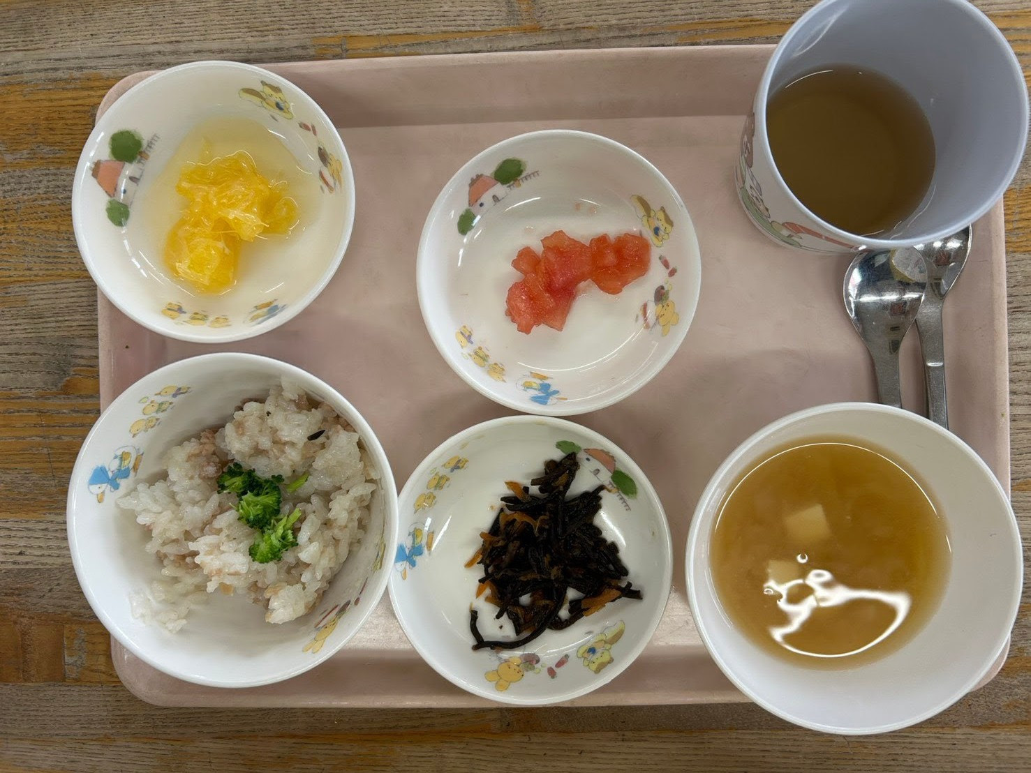 ご飯 みそ汁 鬼の金棒 人参シリシリ トマト 果物