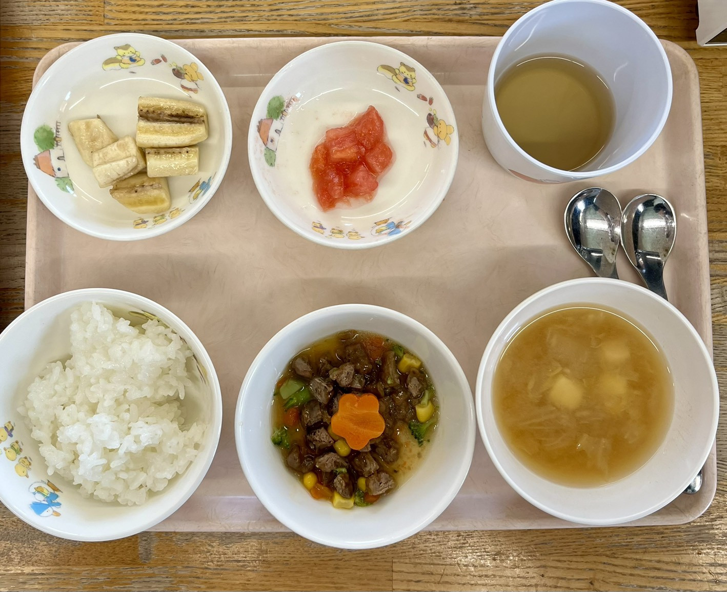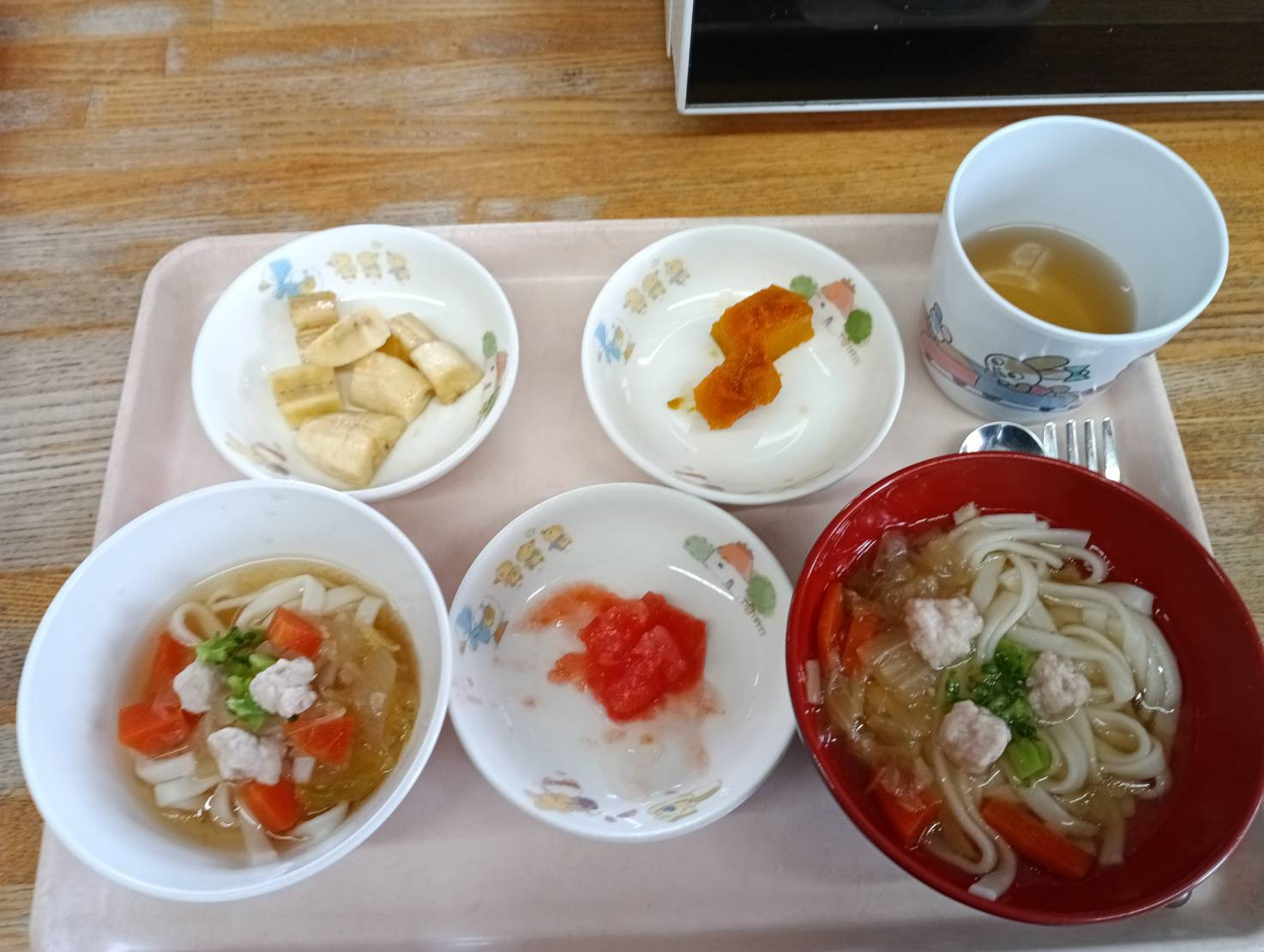 五目うどん かぼちゃのミルク煮 トマト バナナ