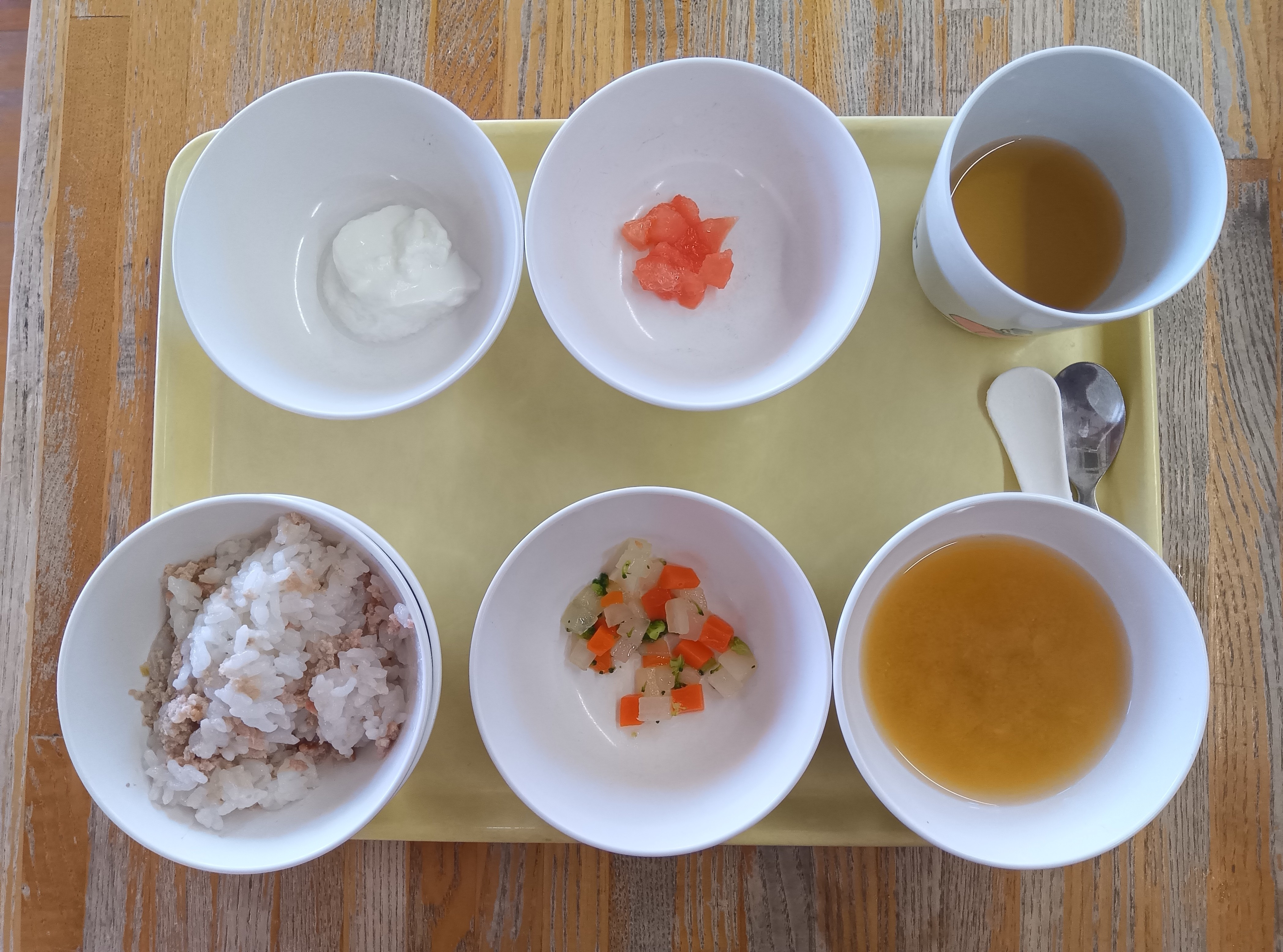鮭ご飯 みそ汁 人参シリシリ トマト ヨーグルト