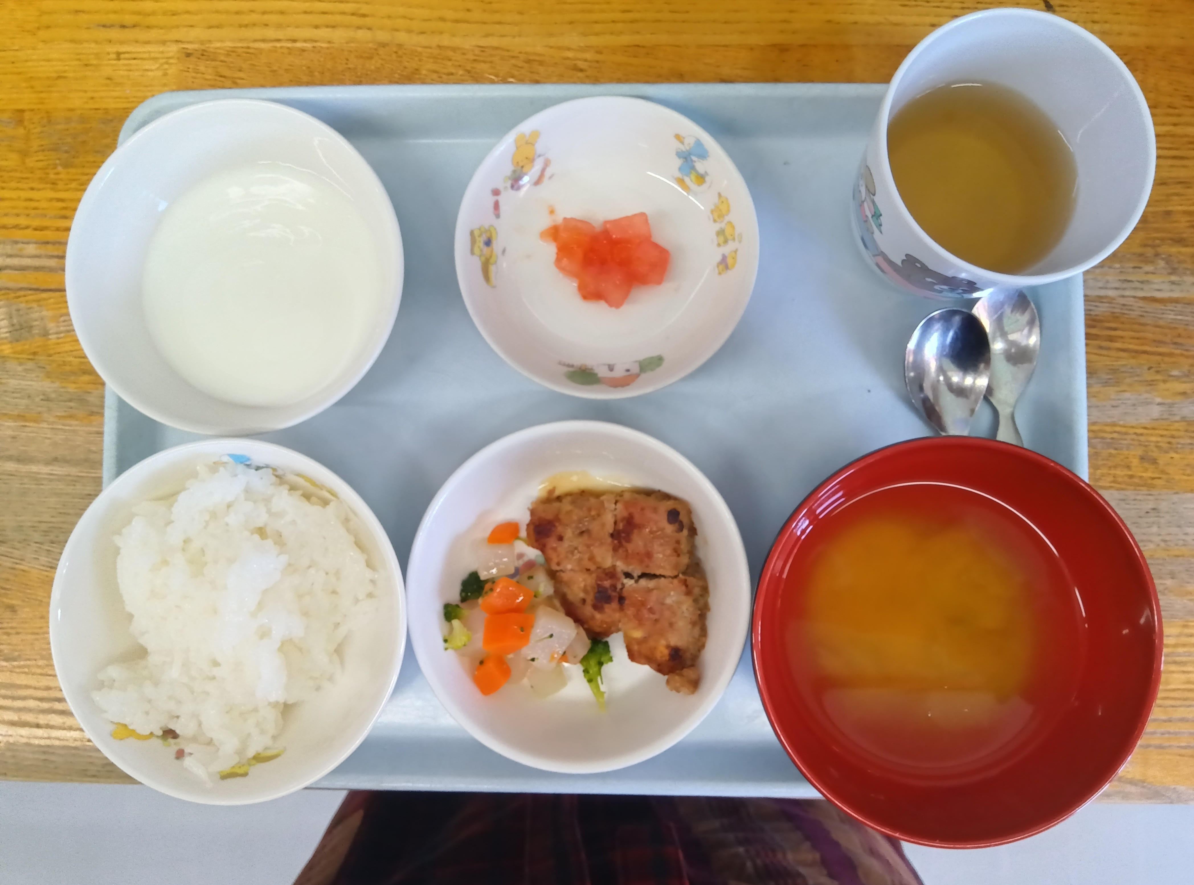 ご飯 みそ汁 豆腐入りミートローフ サラダ トマト ヨーグルト