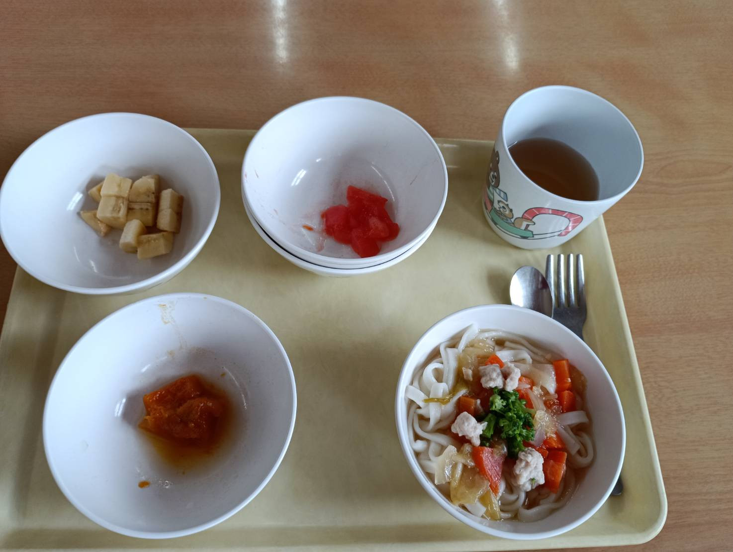 五目うどん カボチャの煮物 トマト ヨーグルト