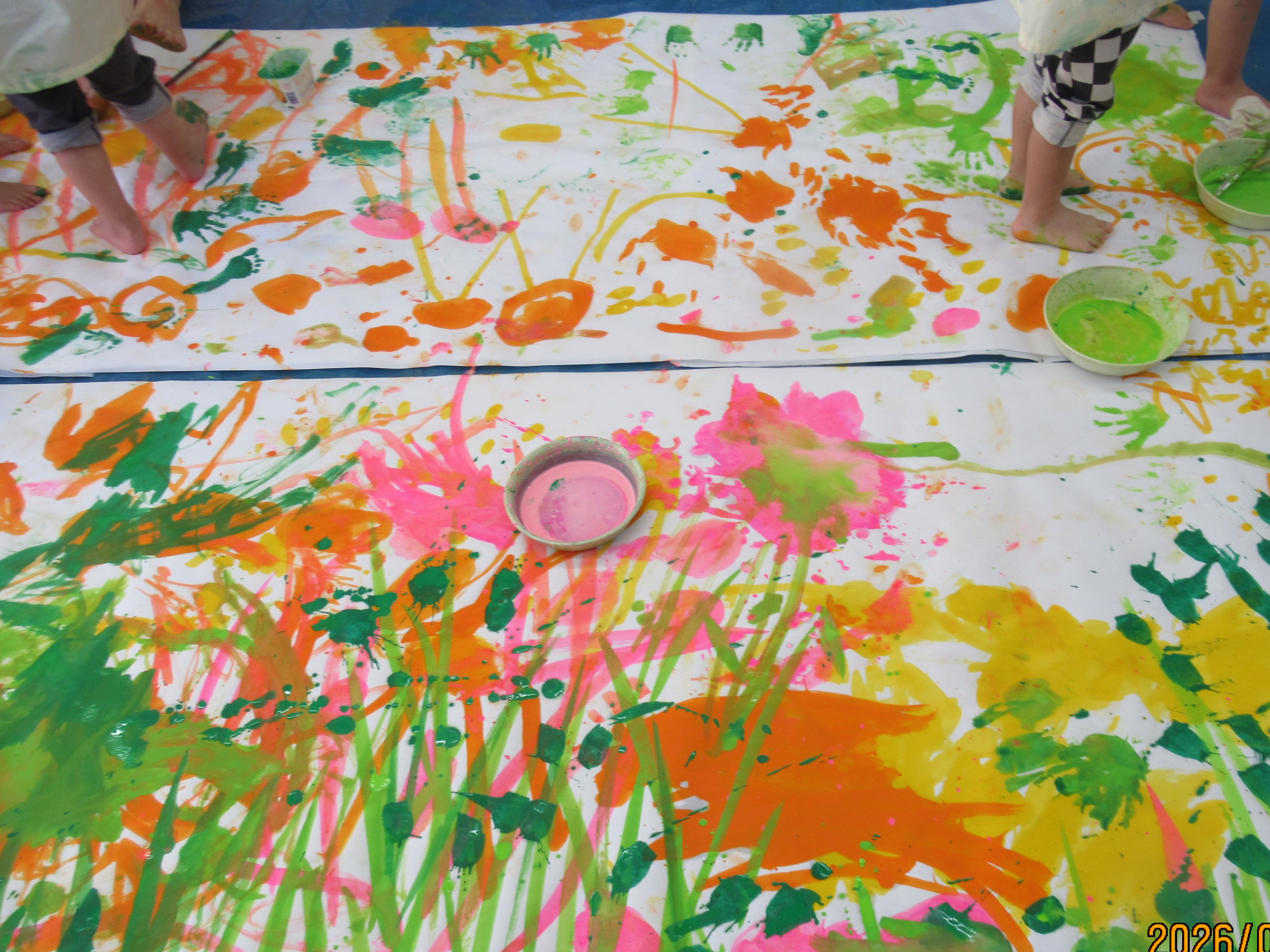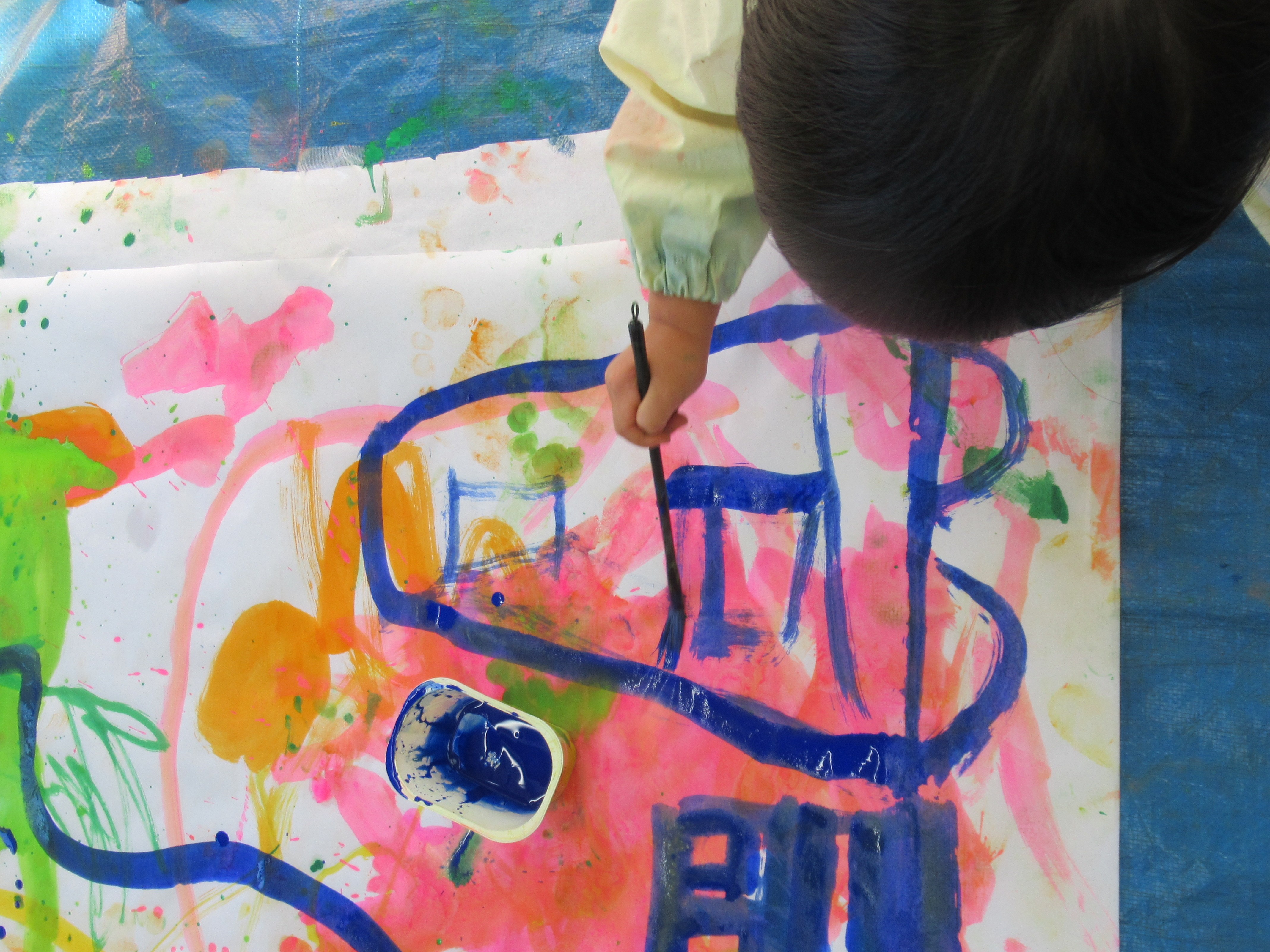 ピンクグループと青グループ。となりのグループに絵の具のお引越しはしないでね。
